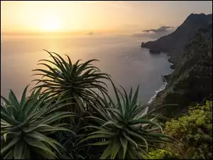 Madera, Morze, Wschód słońca, Portugalia, Aloes, Góry, W