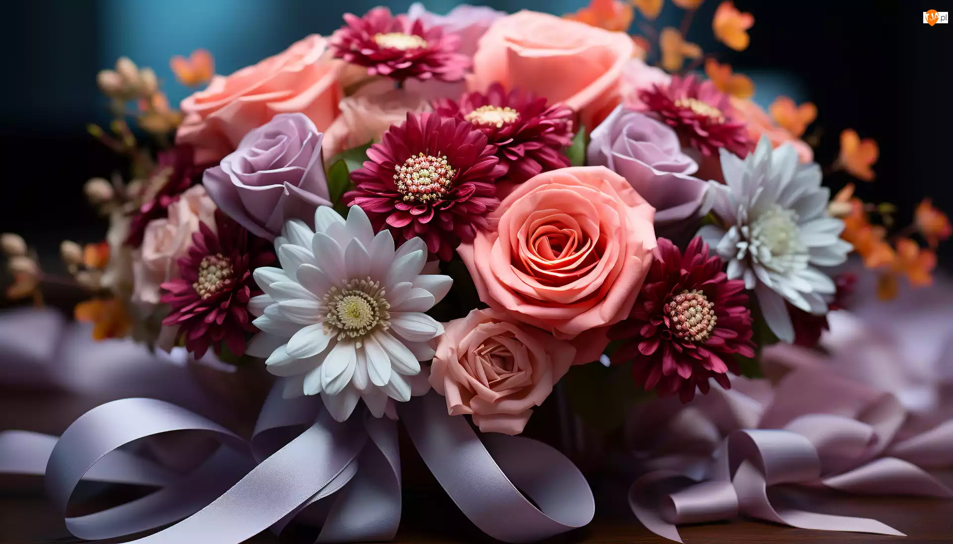 Kwiaty, Bukiet, Gerbery, Kokarda, Róże, Wstążka