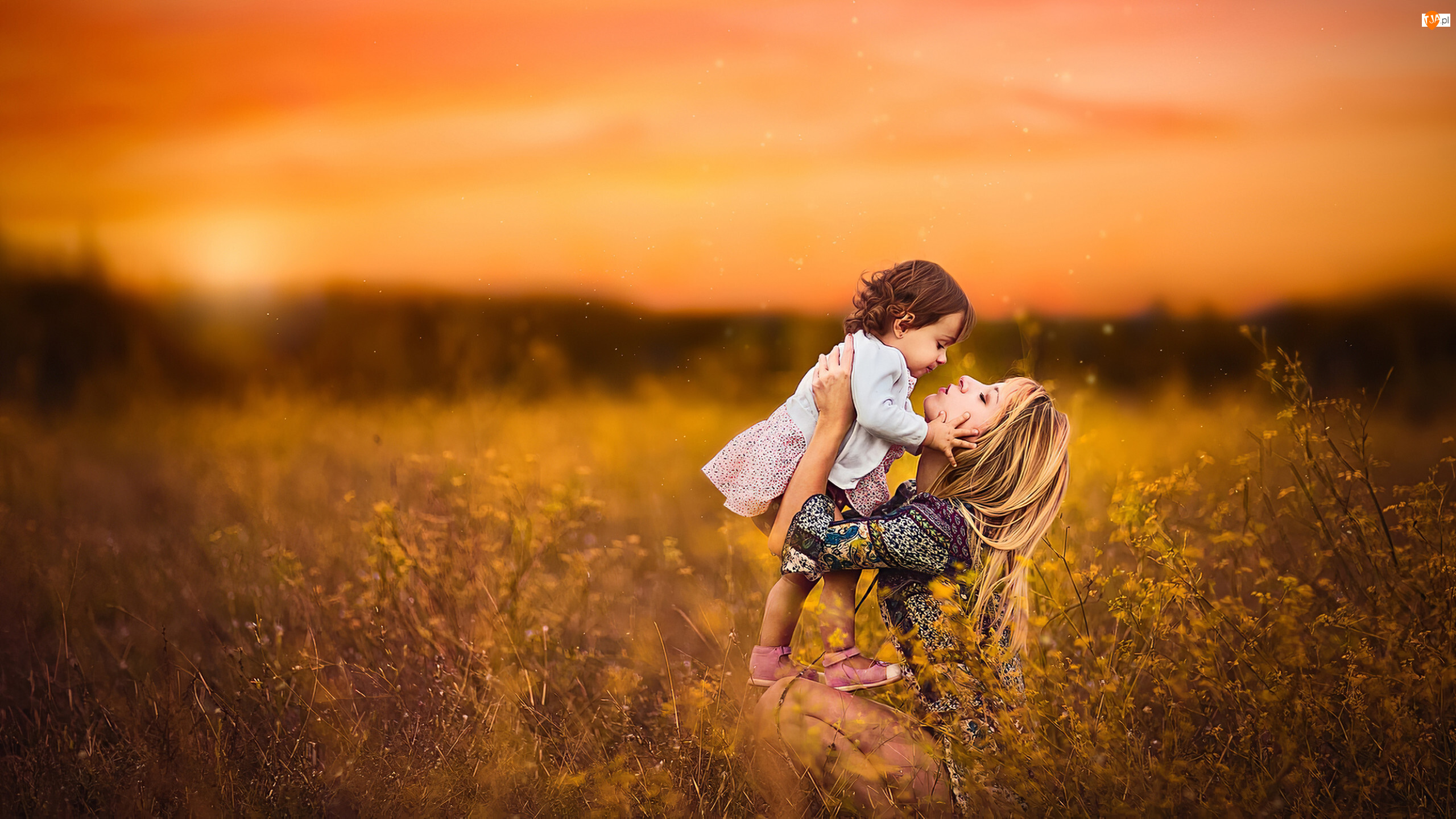 Kwiaty, Kobieta, Zachód słońca, Łąka, Córka, Dziecko, Matka