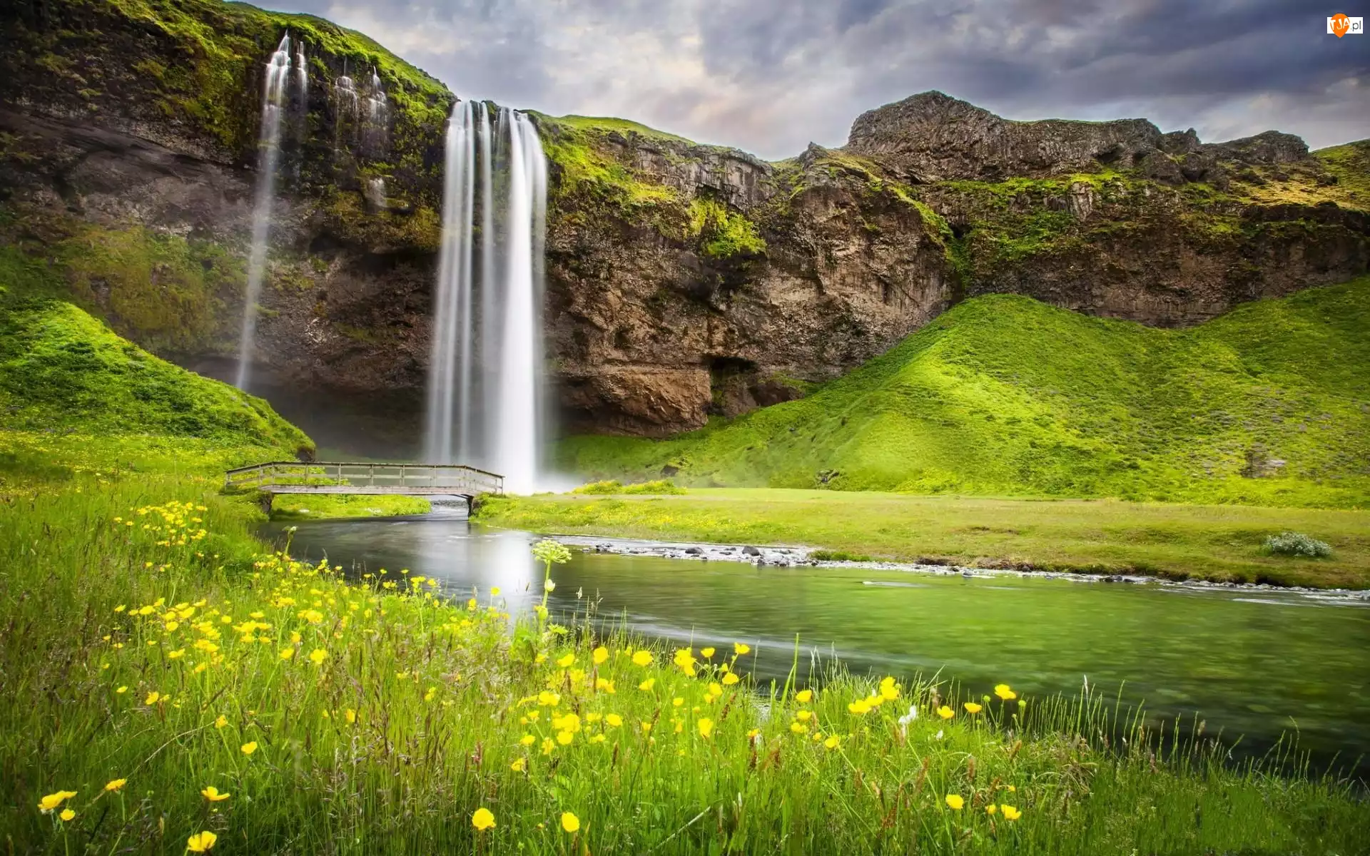 Kwiaty, Mostek, Skały, Wodospad, Wiosna, Rzeczka, Łąka