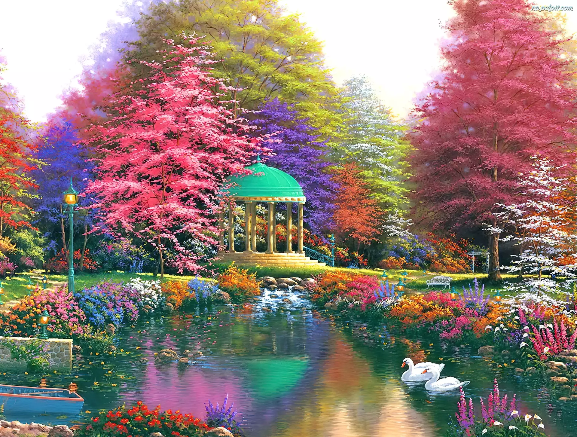Łabędzie, Altanka, Kolorowe, Staw, Drzewa