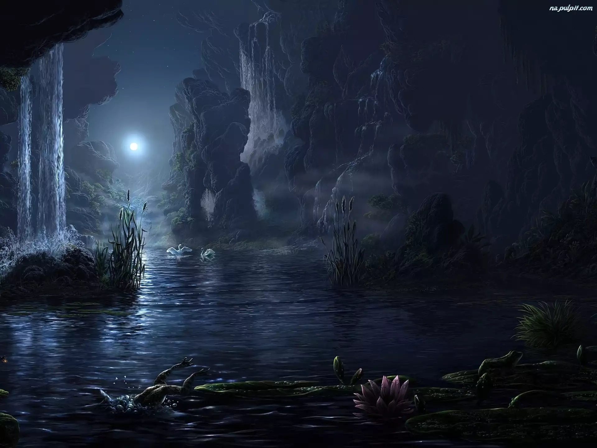 Wodospad, Noc, Lilia, Żaba, Łabędzie, Wodna