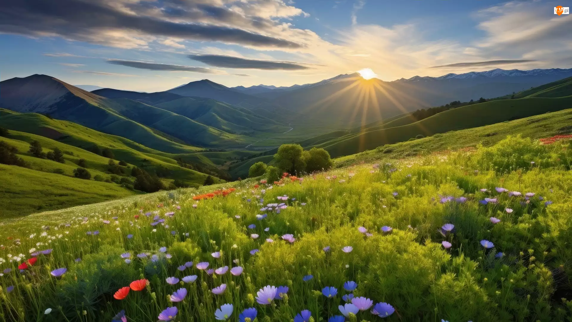Łąka, Góry, Niebo, Grafika, Kwiaty, Promienie s