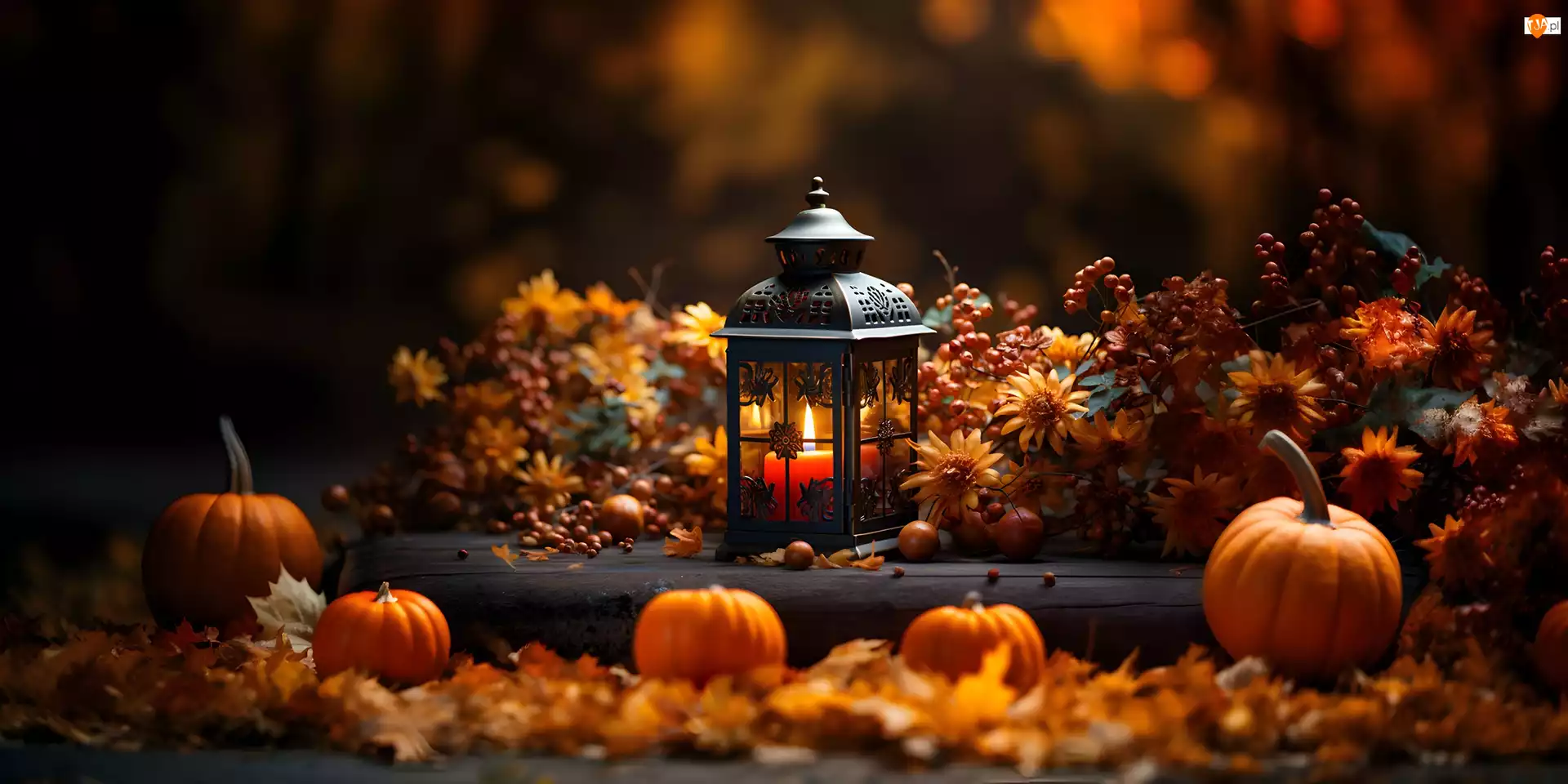 Lampion, Dynie, Dekoracja, Grafika, Kwiaty, Jesienna