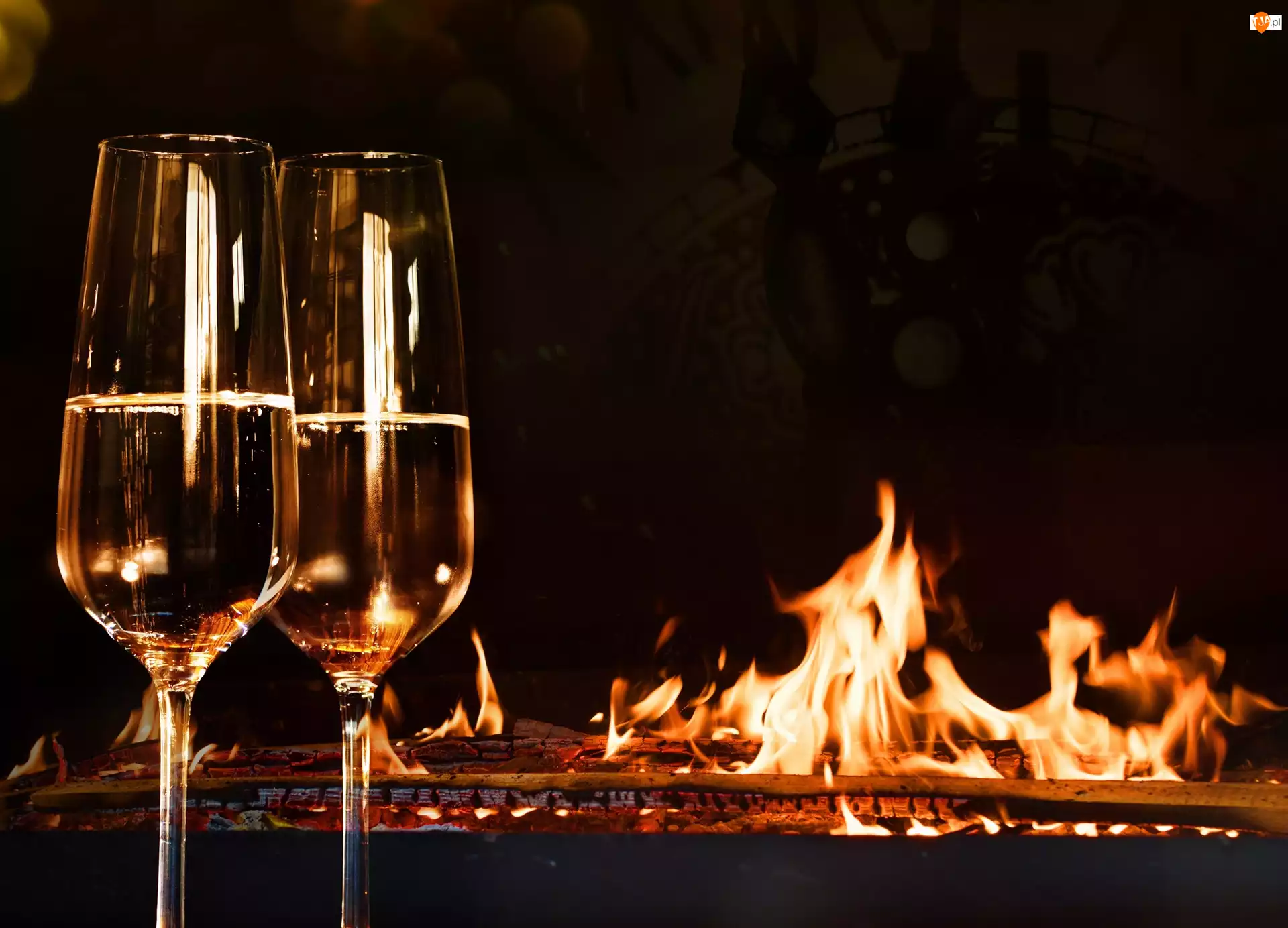 Ogień, Dwa, Szampan, Kieliszki, Kominek