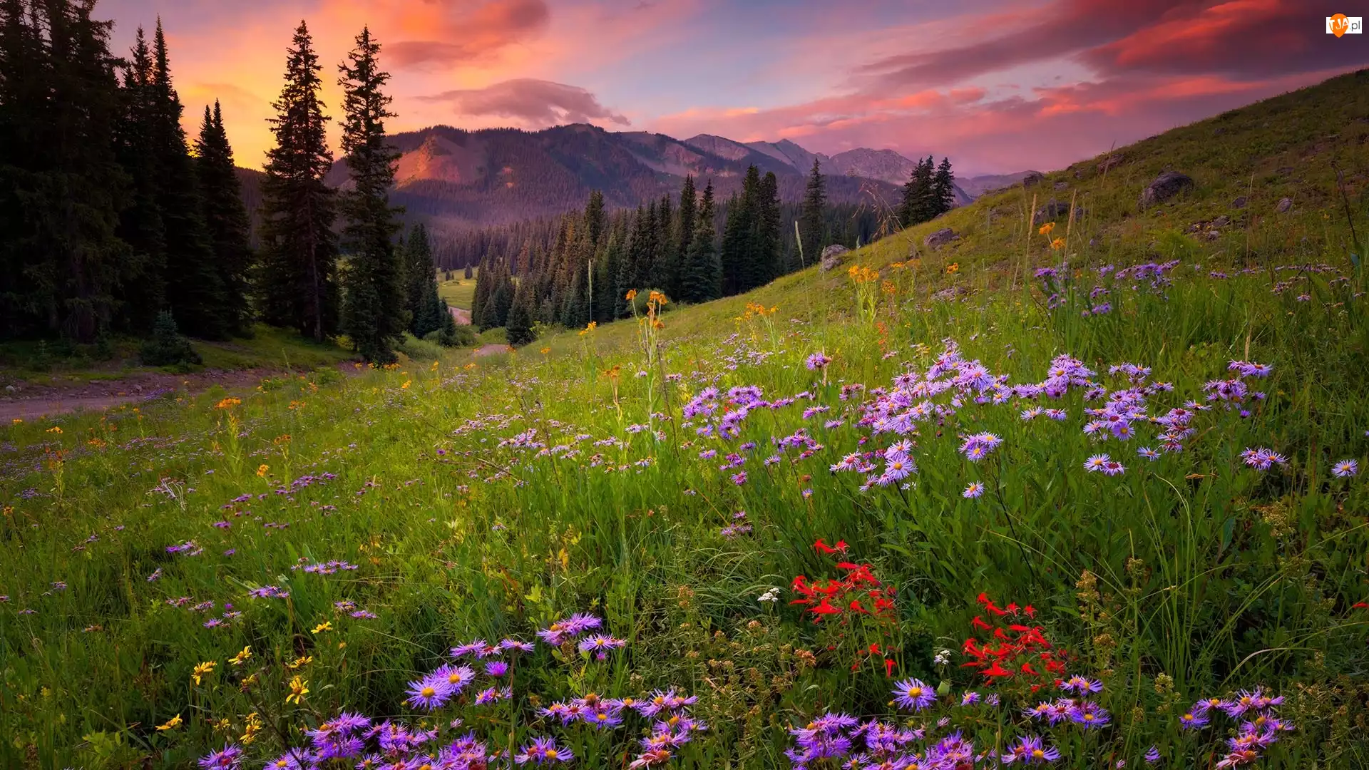 Las, Drzewa, Chmury, Góry, Zachód słońca, Kwiaty, Łąka