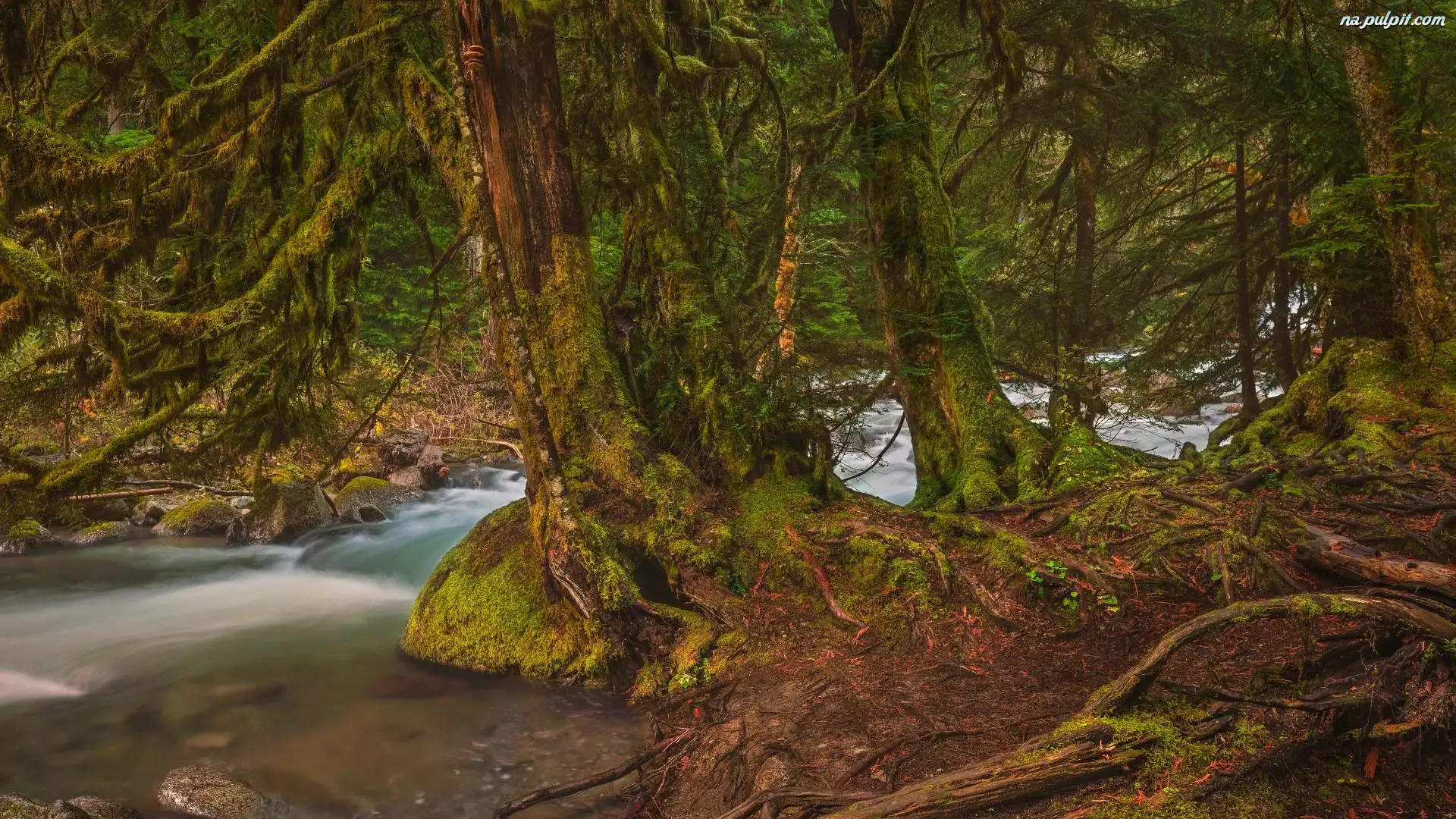 Las, Rzeka, Korzenie, Pnie, Drzewa, Omszałe