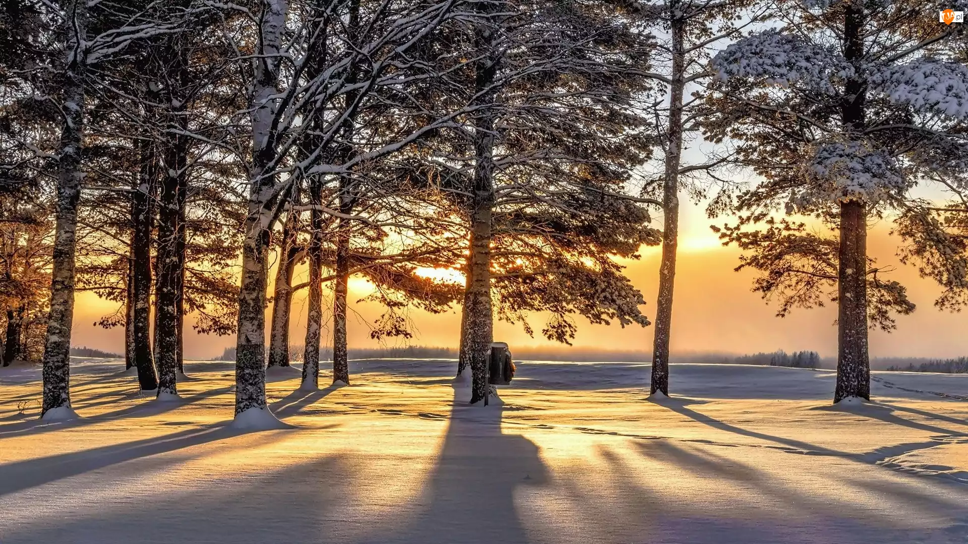 Zima, Las, Przebijające światło, Drzewa, Świt
