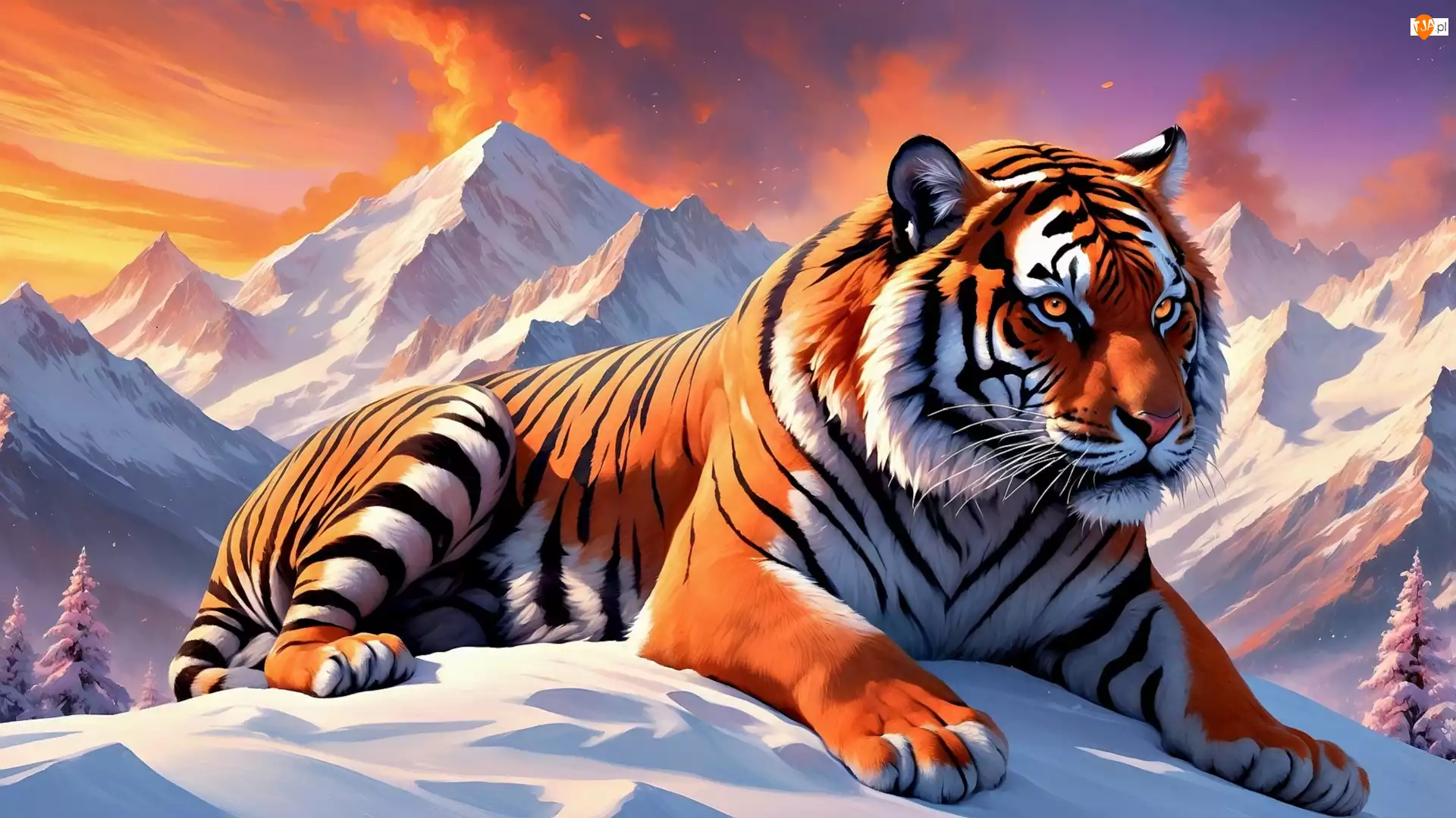 Tygrys, Leżący, Zima, Grafika, Śnieg, Góry