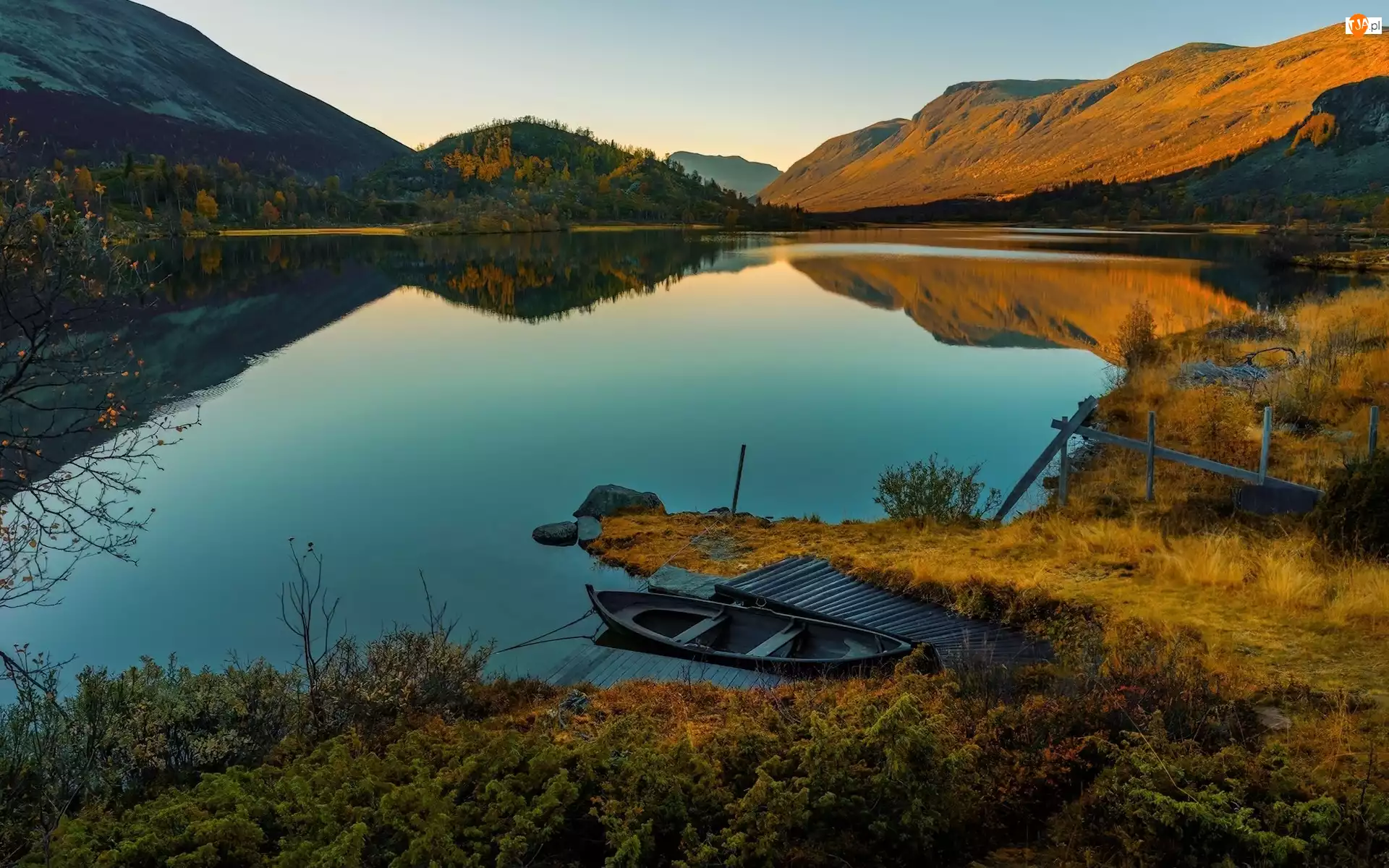Łódka, Jesień, Jezioro, Góry, Pomost