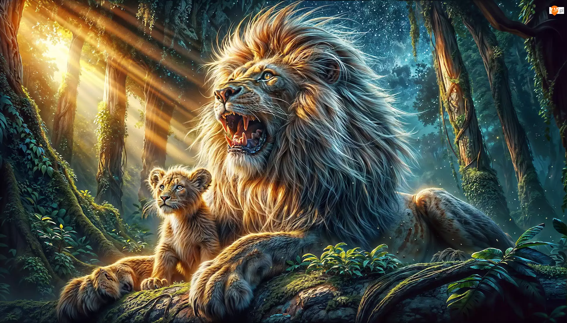 Lwiątko, Drzewa, Lew, Grafika, Przebijające światło