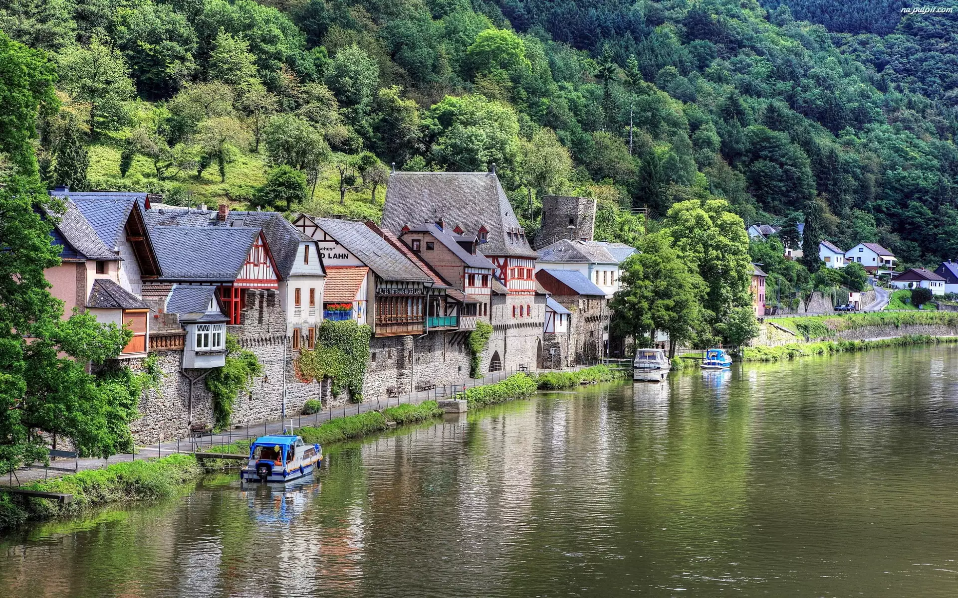 Dauzenau, Niemcy, Rzeka, Łodzie, Miasto, Domy
