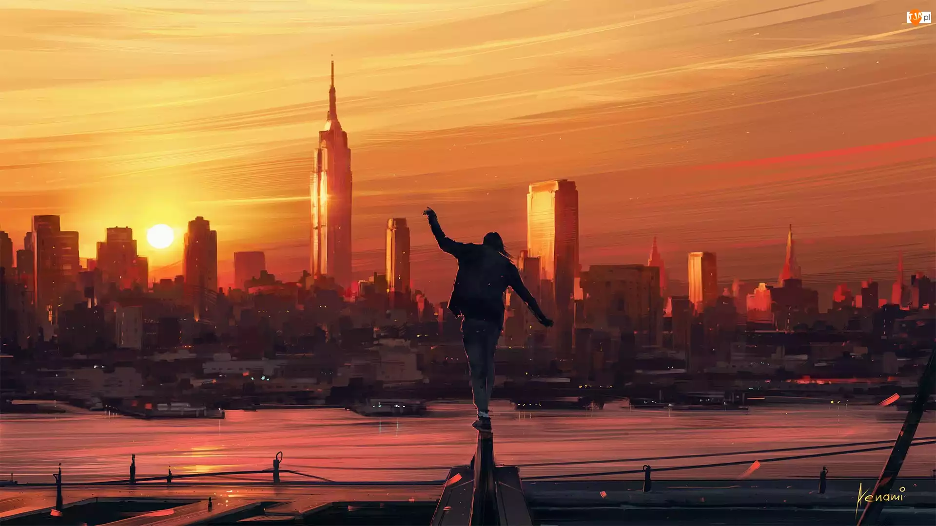 Zdjęcia miasta, Chłopak, Wieżowce, Zachód słońca