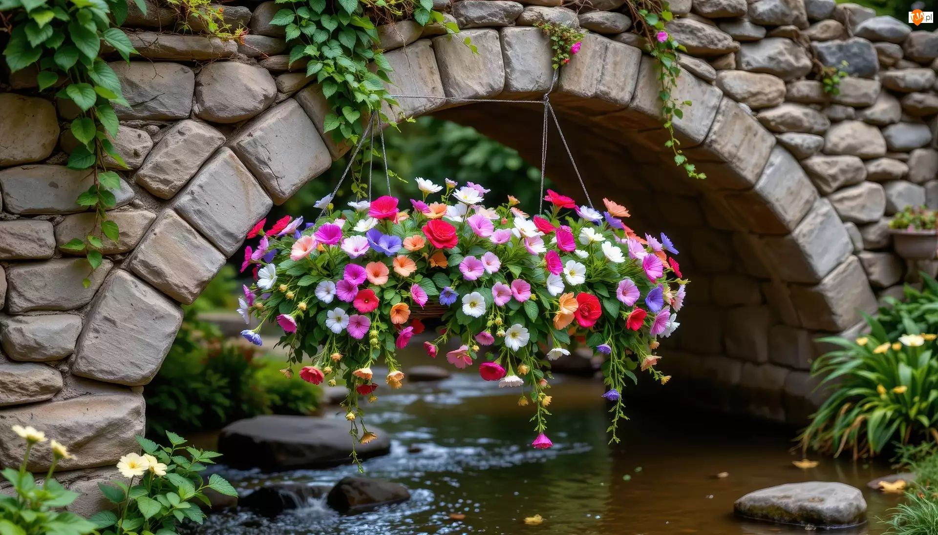 Most, Kamienny, Kolorowe, Grafika, Wiszące, Kwiaty