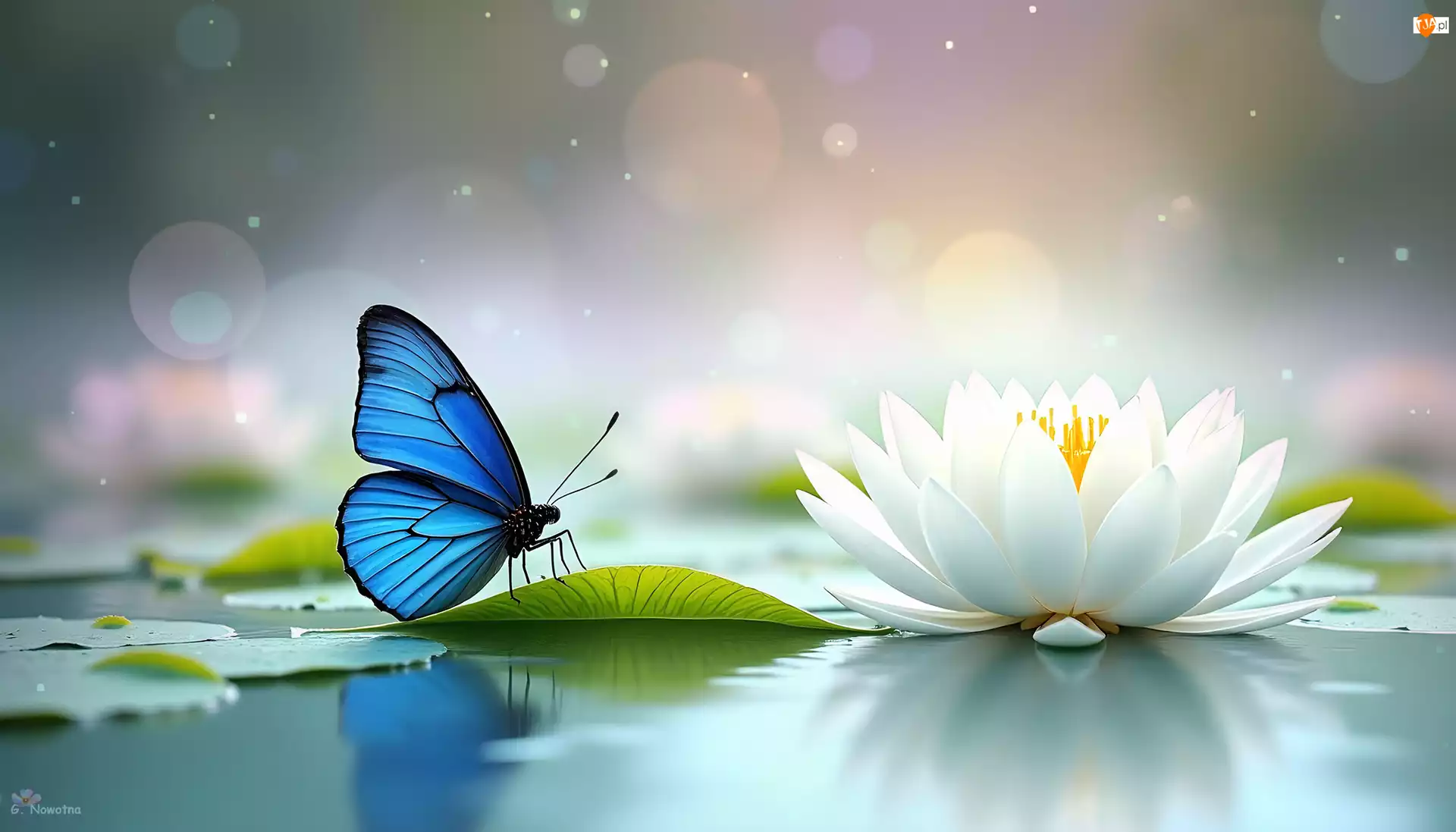 Motyl, Niebieski, Lilia wodna, Grafika AI, Biała,