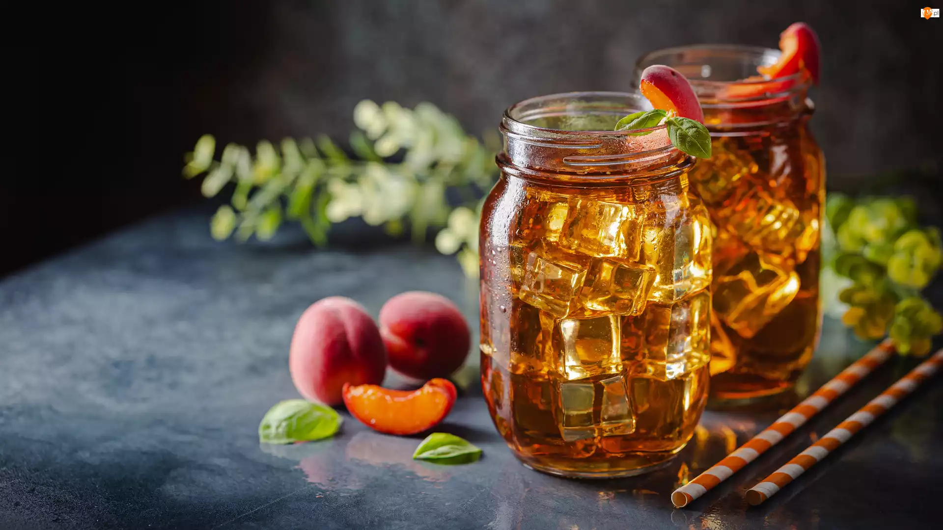 Lód, Słoiki, Owoce, Rozmyte tło, Herbata, Brzoskwinie