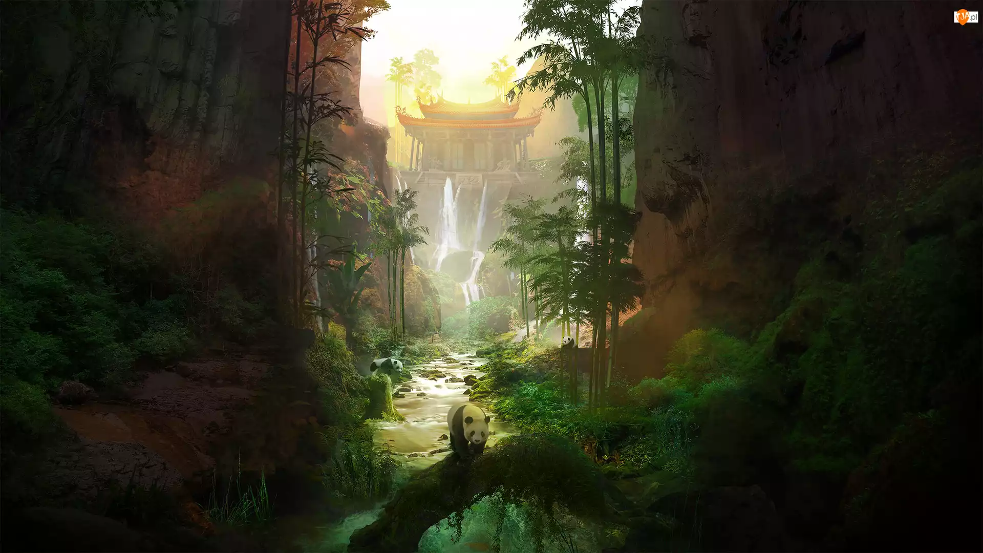 Niedźwiedzie, Grafika, Wąwóz, Pandy, Skały, Pagoda, Roślinność, Rzeka
