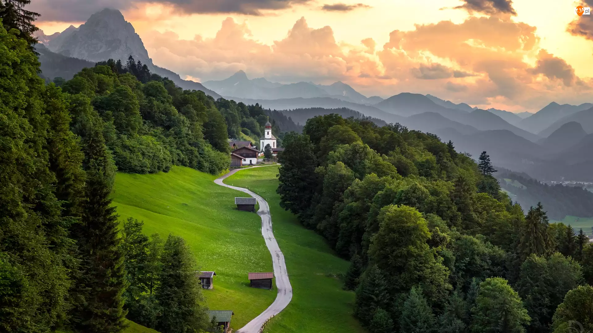 Niemcy, Góry, Bawaria, Drzewa, Chmury, Wzgórza, Droga, Wieś Wamberg, Kościół św Anny