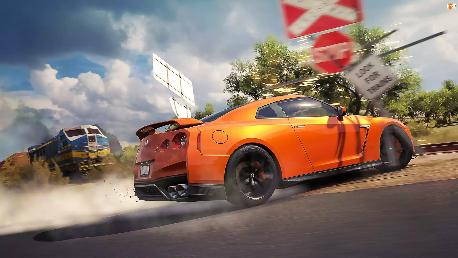 Przejazd, Forza Horizon 3, Tory, Ulica, Lokomotywa, Samochód, Nissan GT-R, Gra, Pomarańczowy