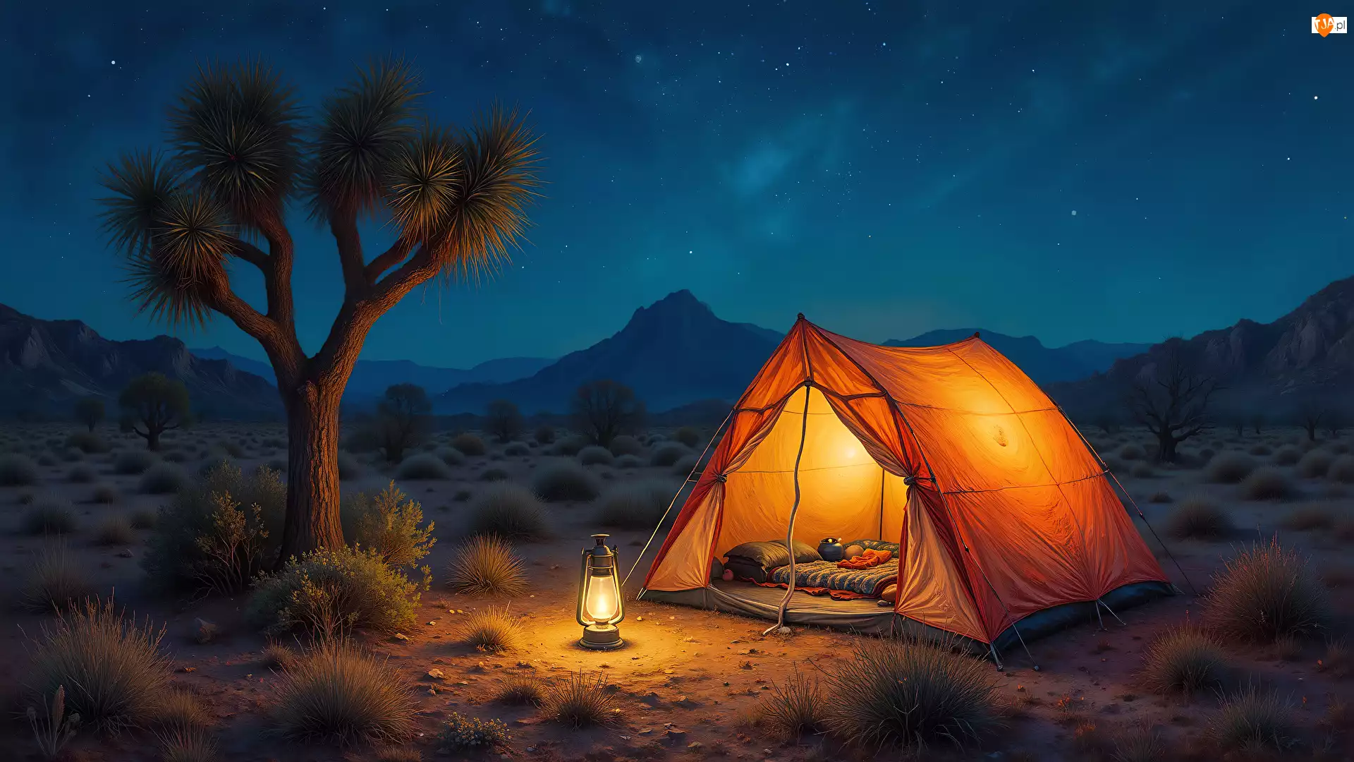 Noc, Gwiazdy, Grafika AI, Góry, Drzewo, Lampa naftowa, Namiot