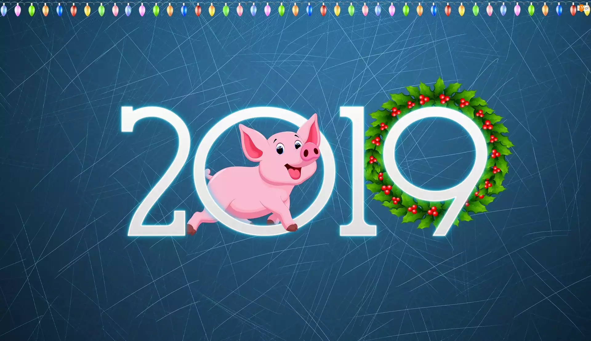 Nowy Rok 2019 z świnką i zielonym wieńcem