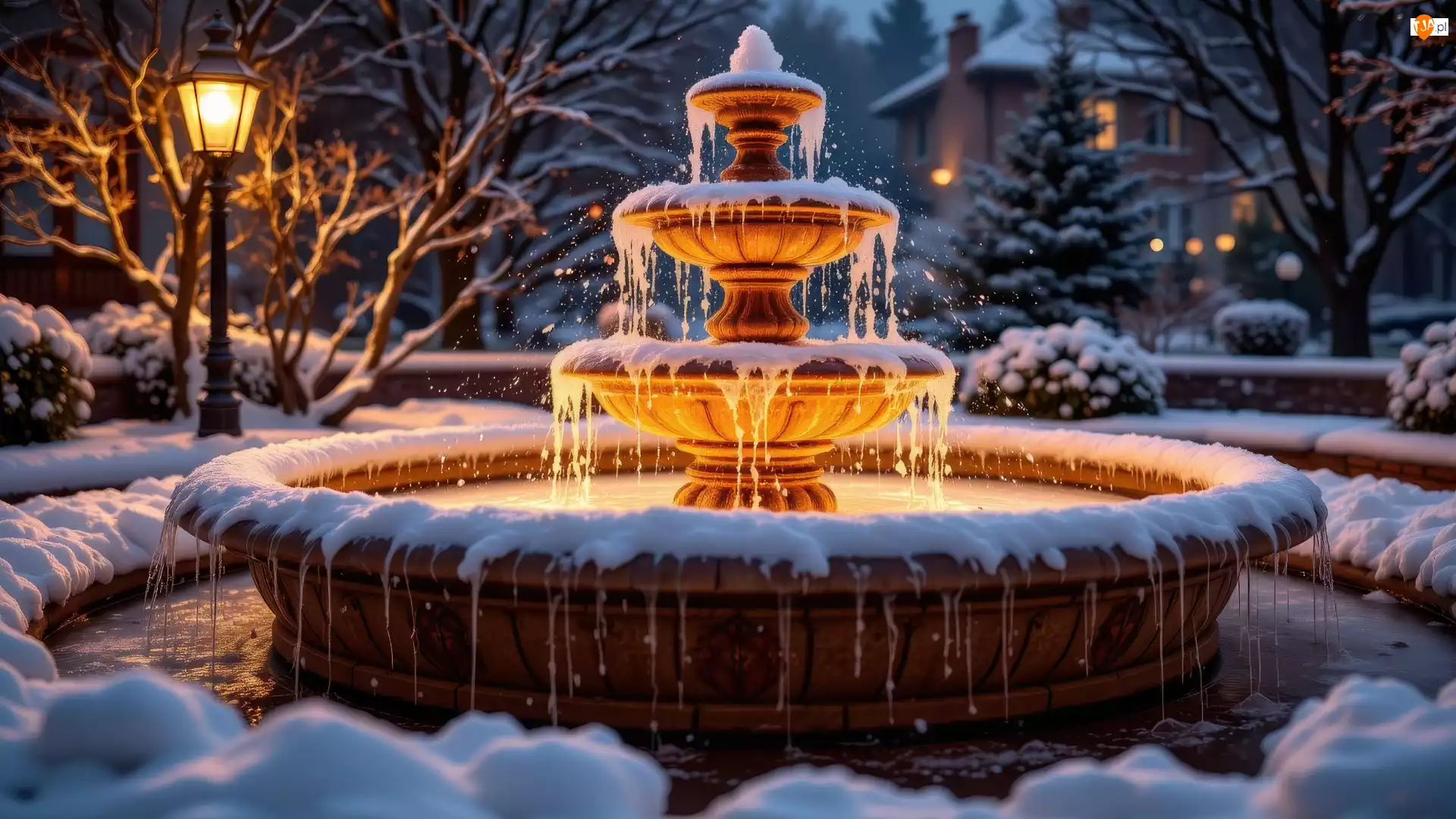 Ośnieżone, Zima, Fontanna, Drzewa, Śnieg, Latarnia, AI, Park