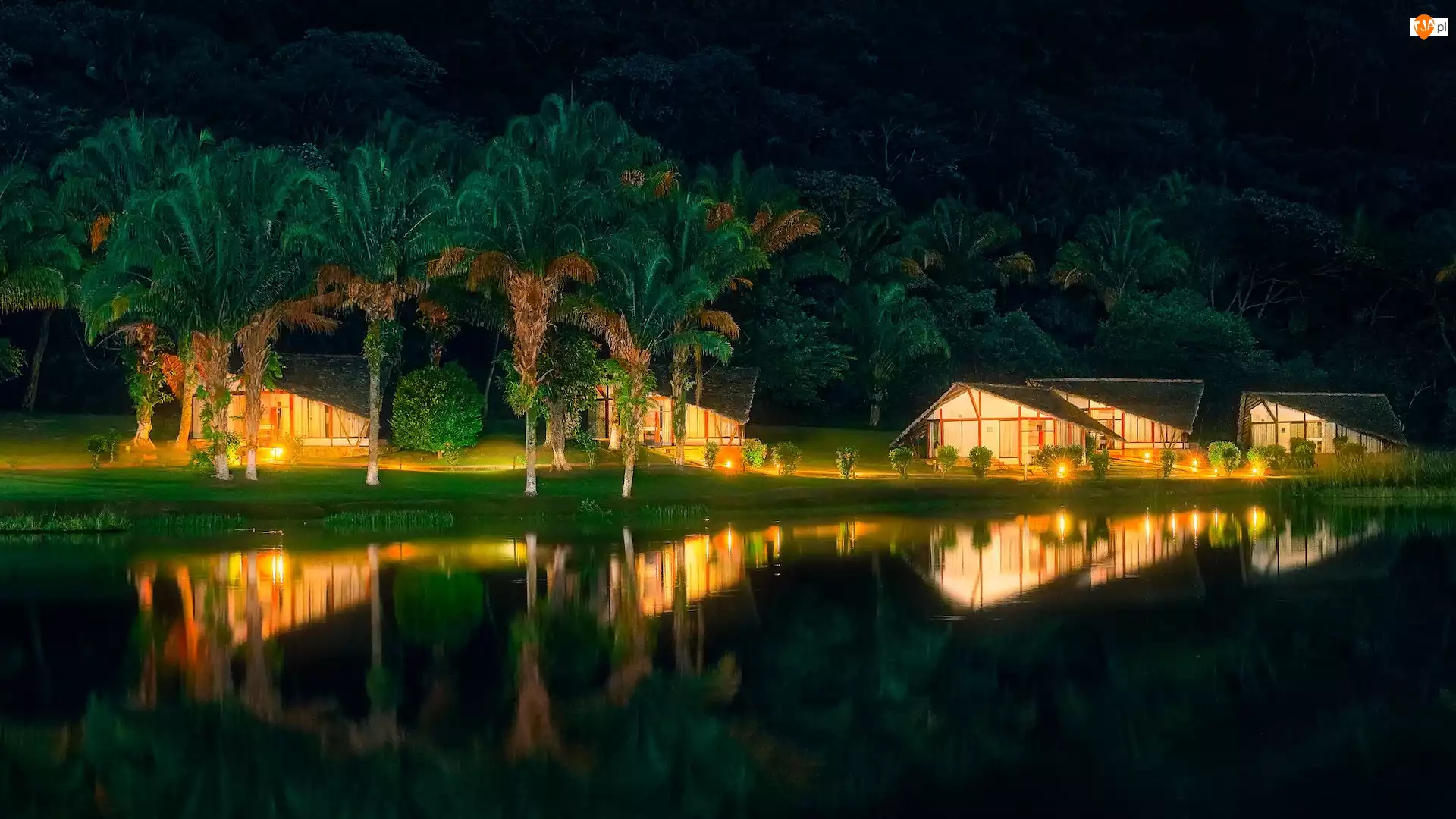 Odbicie, Boliwia, Domki, Jezioro, Santa Cruz, Palmy, Volcan Lake, Oświetlone