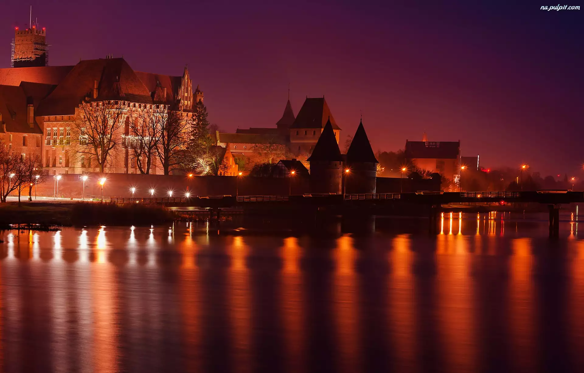 Rzeka Nogat, Noc, Malbork, Polska, Zamek