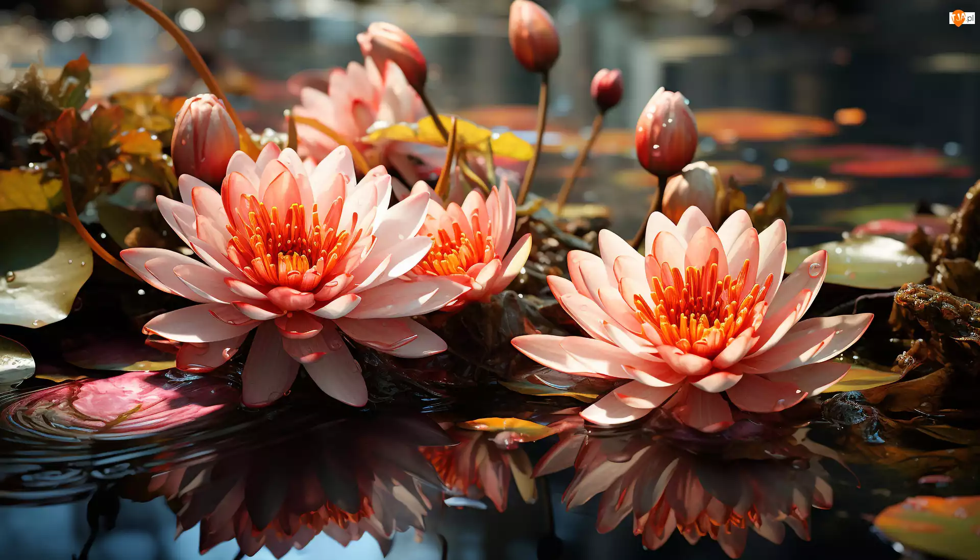 Pąki, 2D, Kwiaty, Lilie wodne, Odbicie