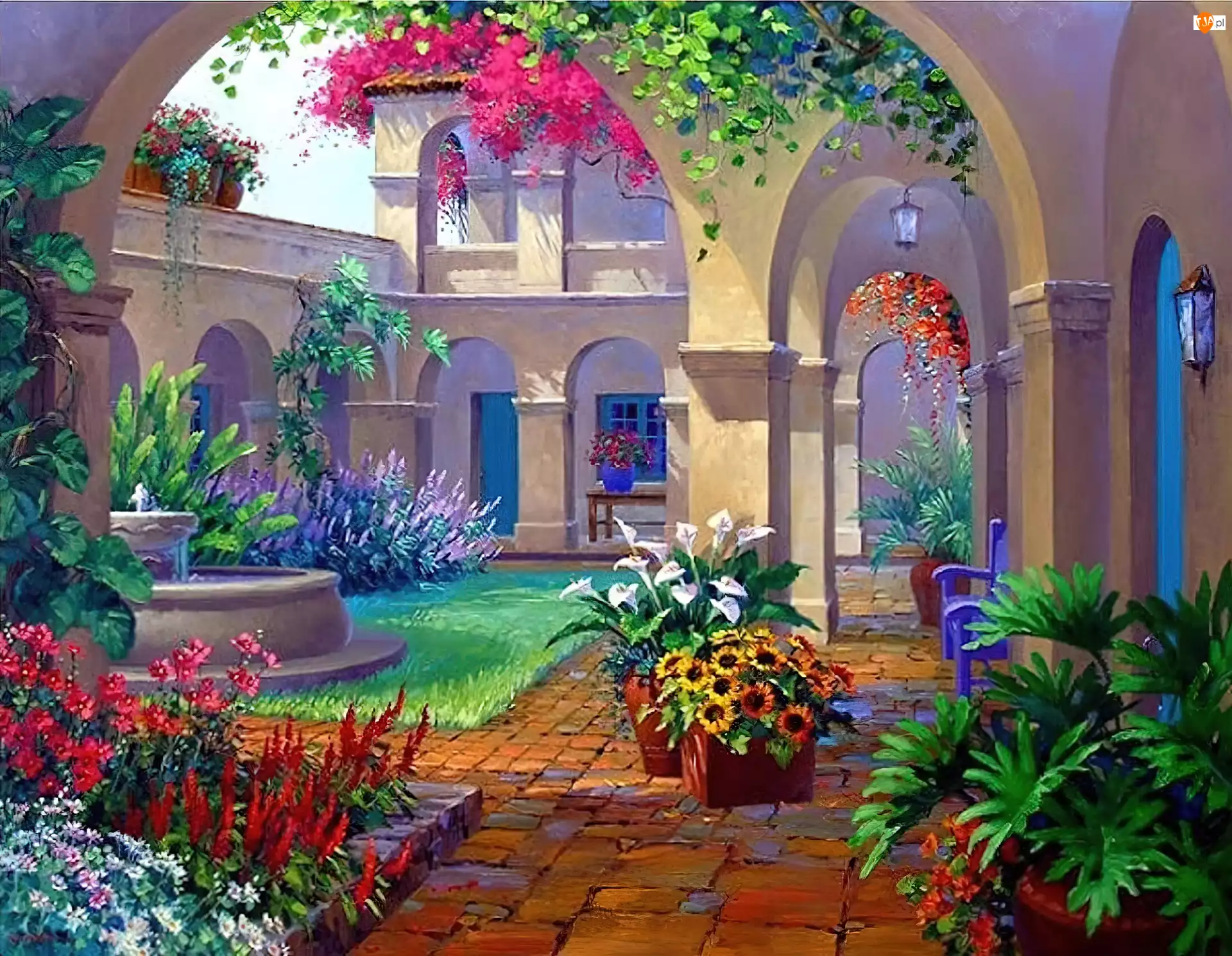 Patio, Reprodukcje Obrazów, Kwiaty, Fontanna
