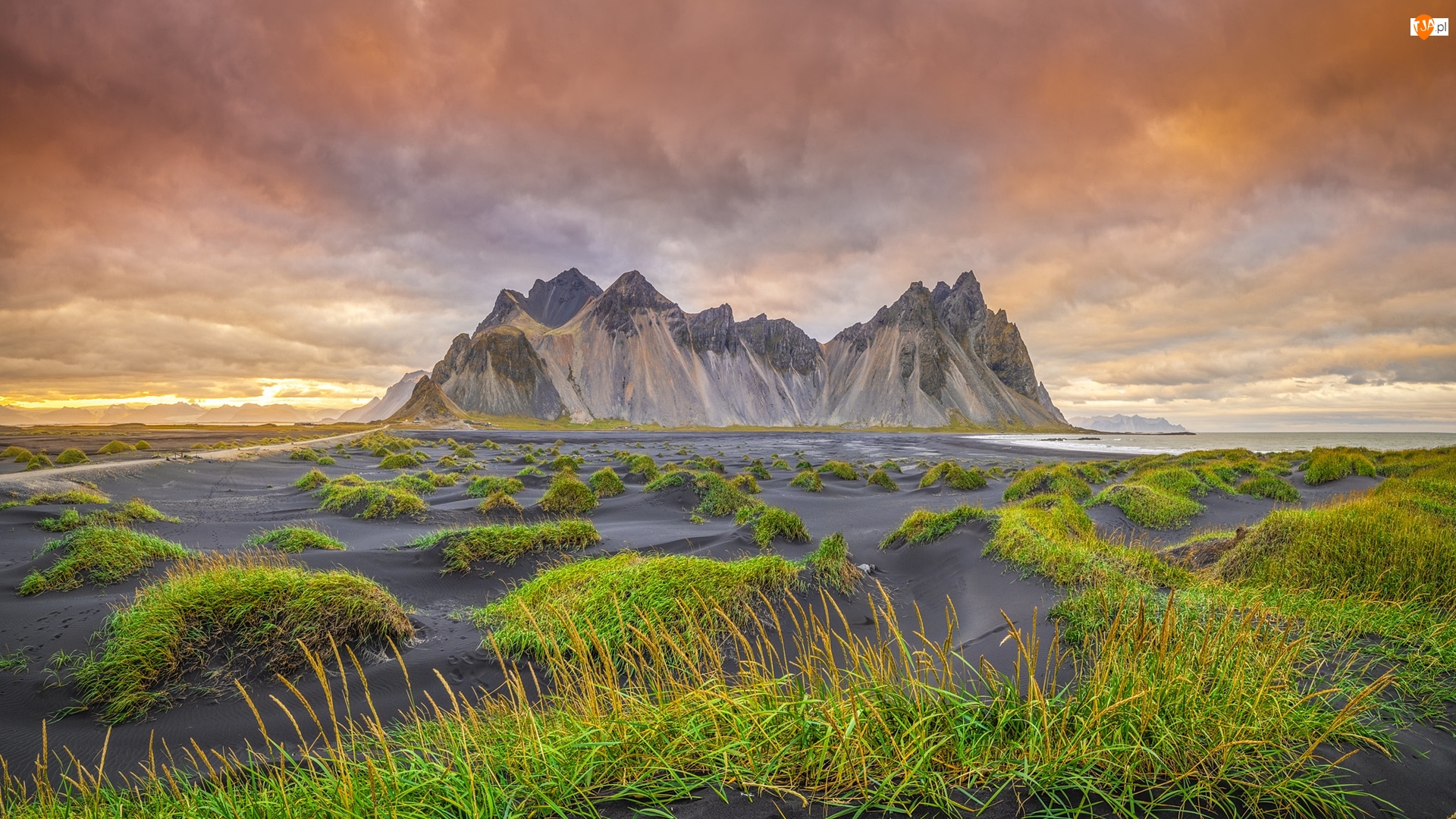 Piasek, Islandia, Plaża, Trawa, Góry, Czarny, Niebo, Góra Vestrahorn