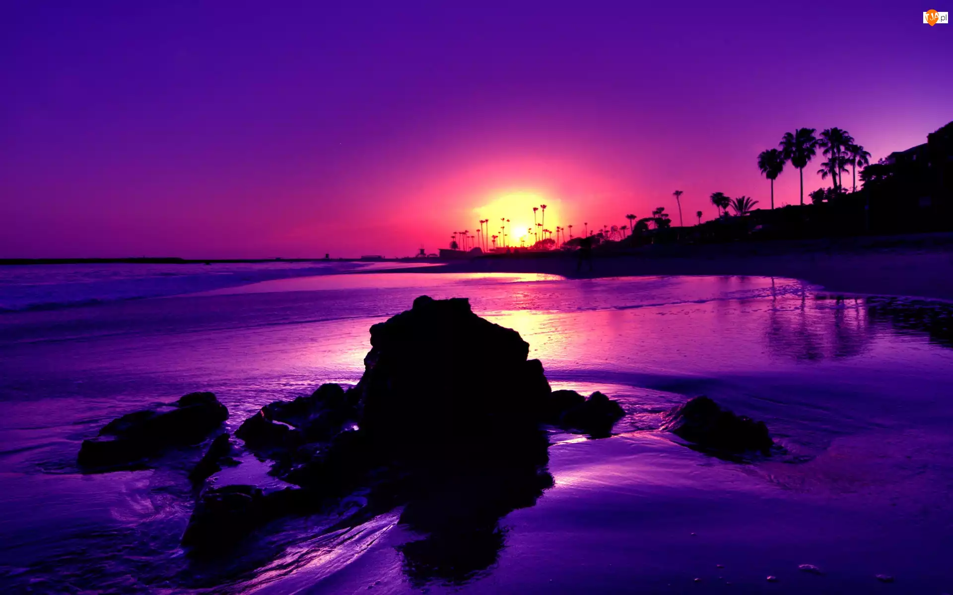 Promienie, Fale, Zachód, Skały, Słońce, Morze