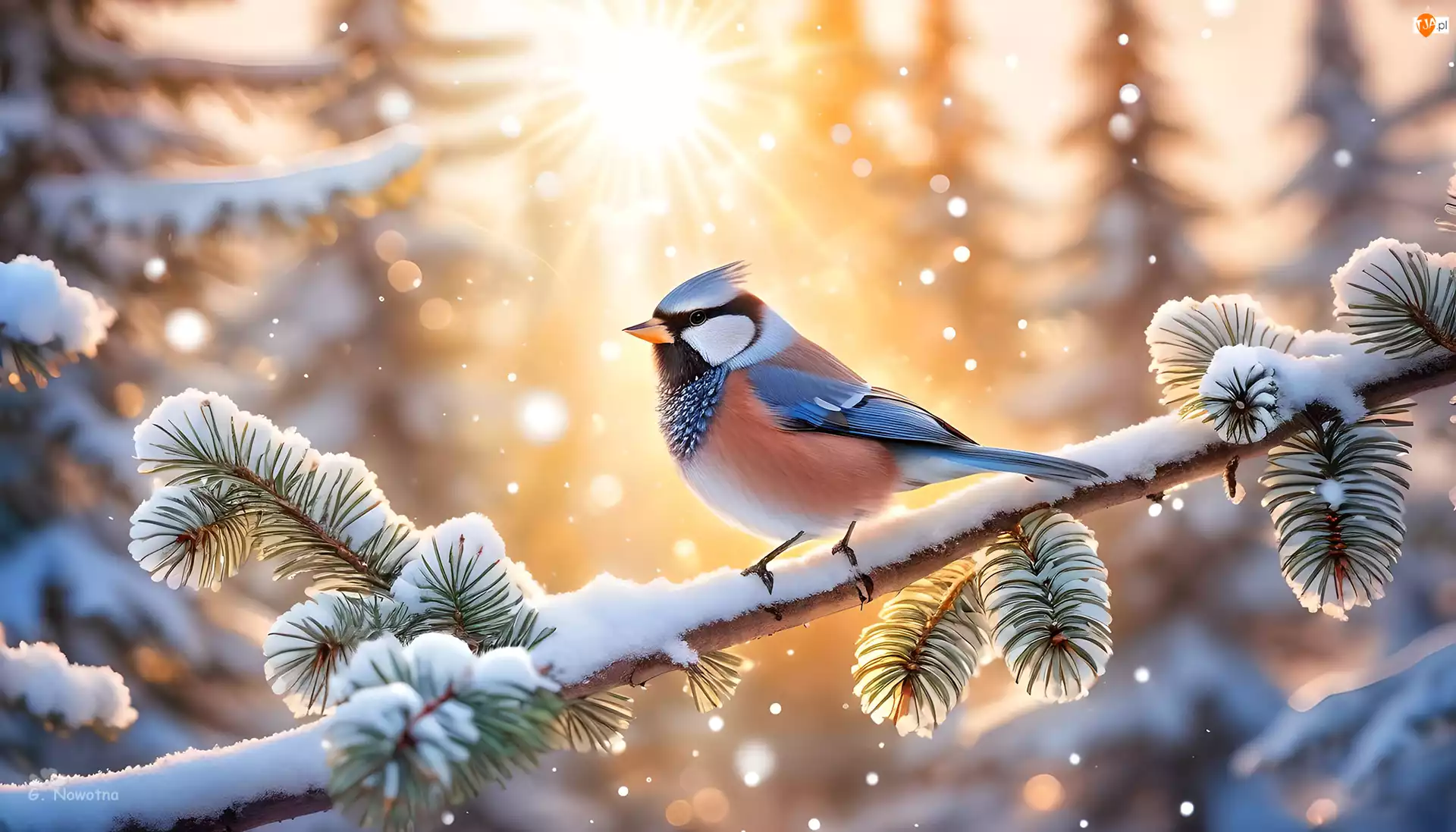 Ptak, Kolorowy, Gałązka, Grafika, Ośnieżona, Świerk