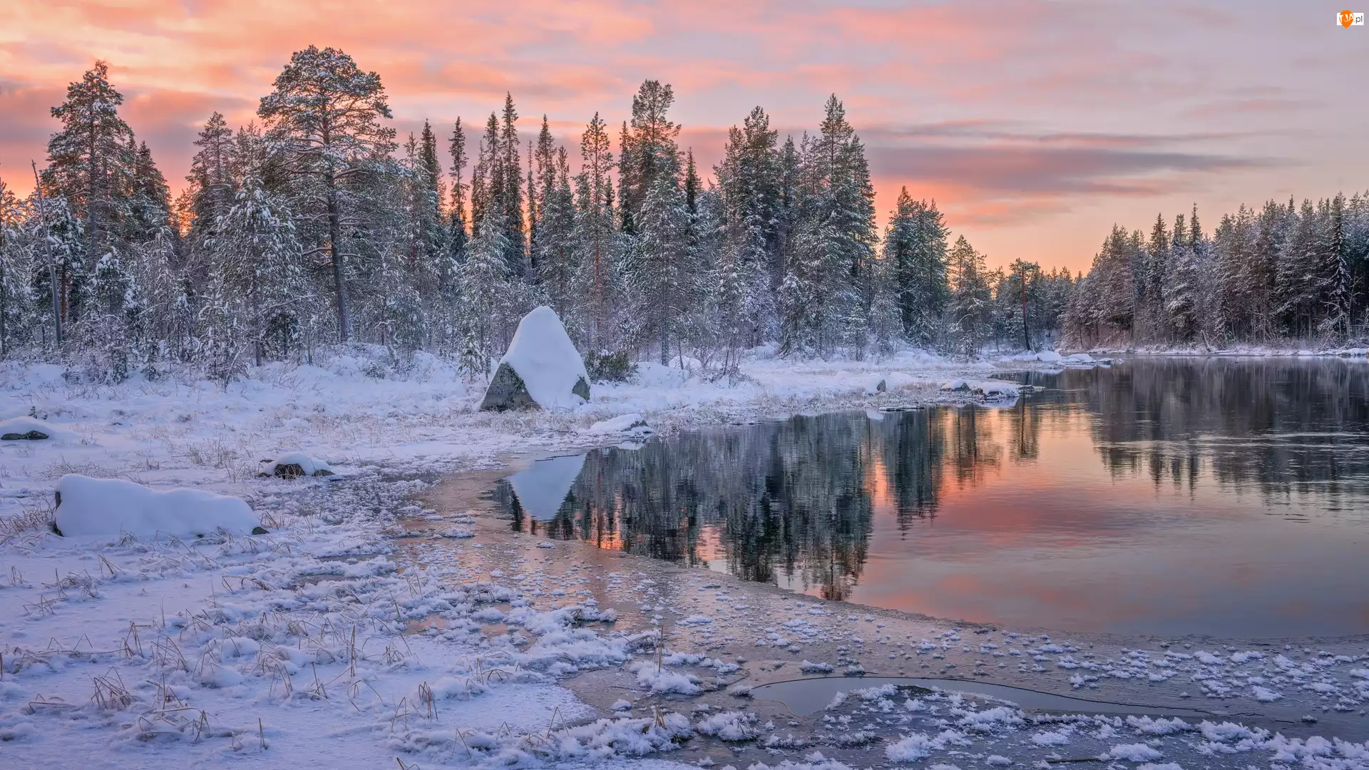 Rosja, Las, Obwód murmański, Kolvitsa, Półwysep Kolski, Ośnieżone, Drzewa, Zima, Rzeka