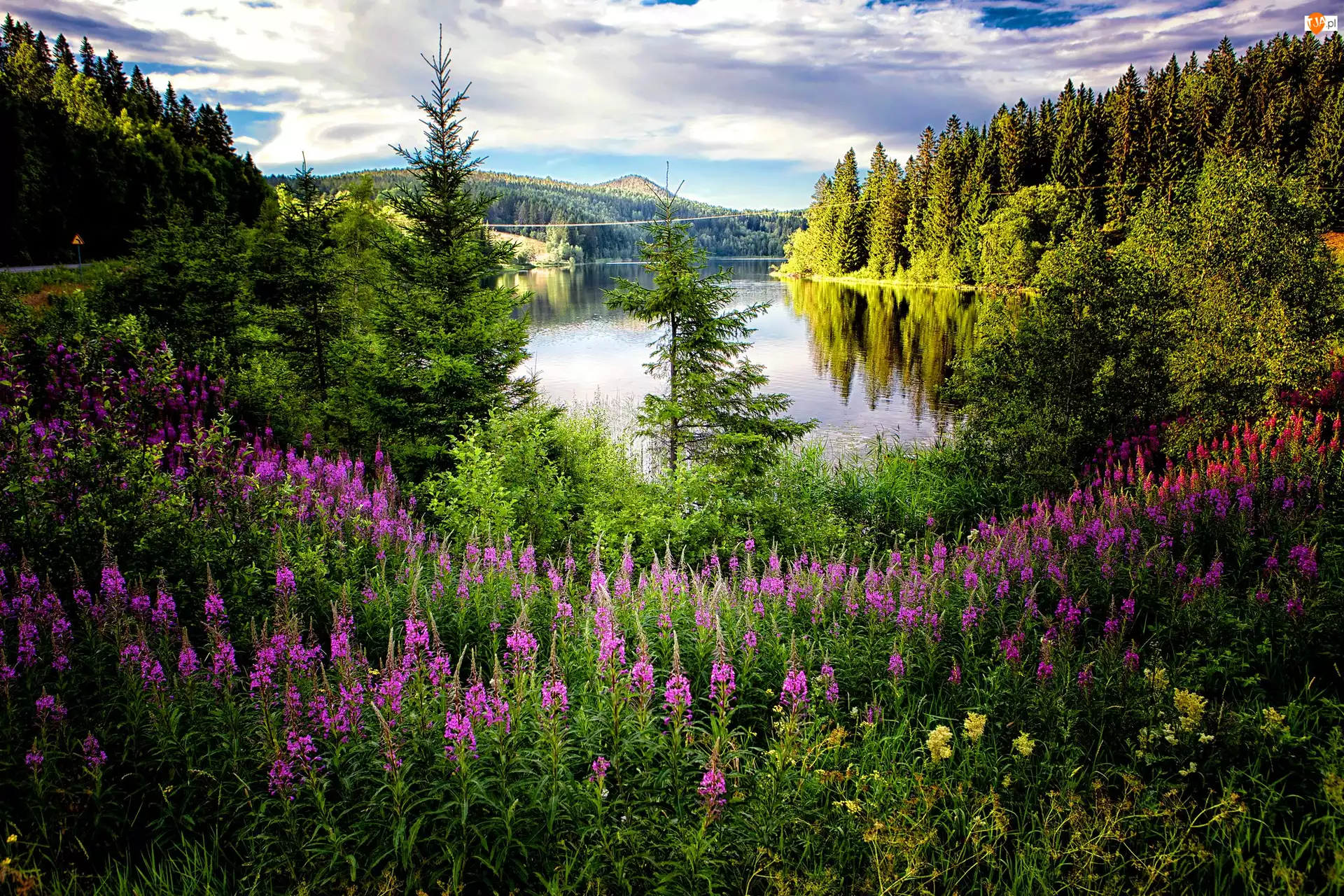 Wzgórza, Kwiaty, Drzewa, Niebo, Trawa, Jezioro, Chmury, Rośliny
