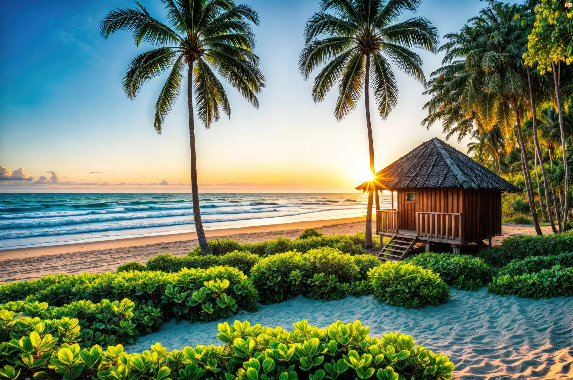 Rośliny, Domek, Grafika, Plaża, Tropiki, Palmy,