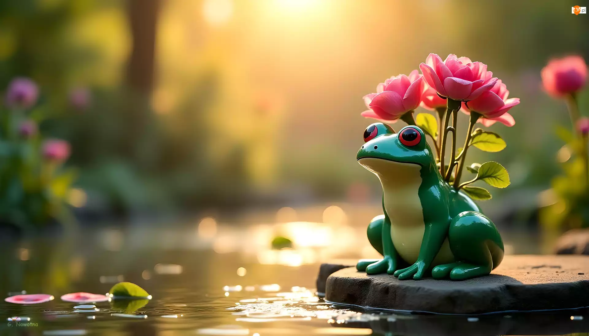 Różowe, Grafika, Doniczka, Żaba, Róże