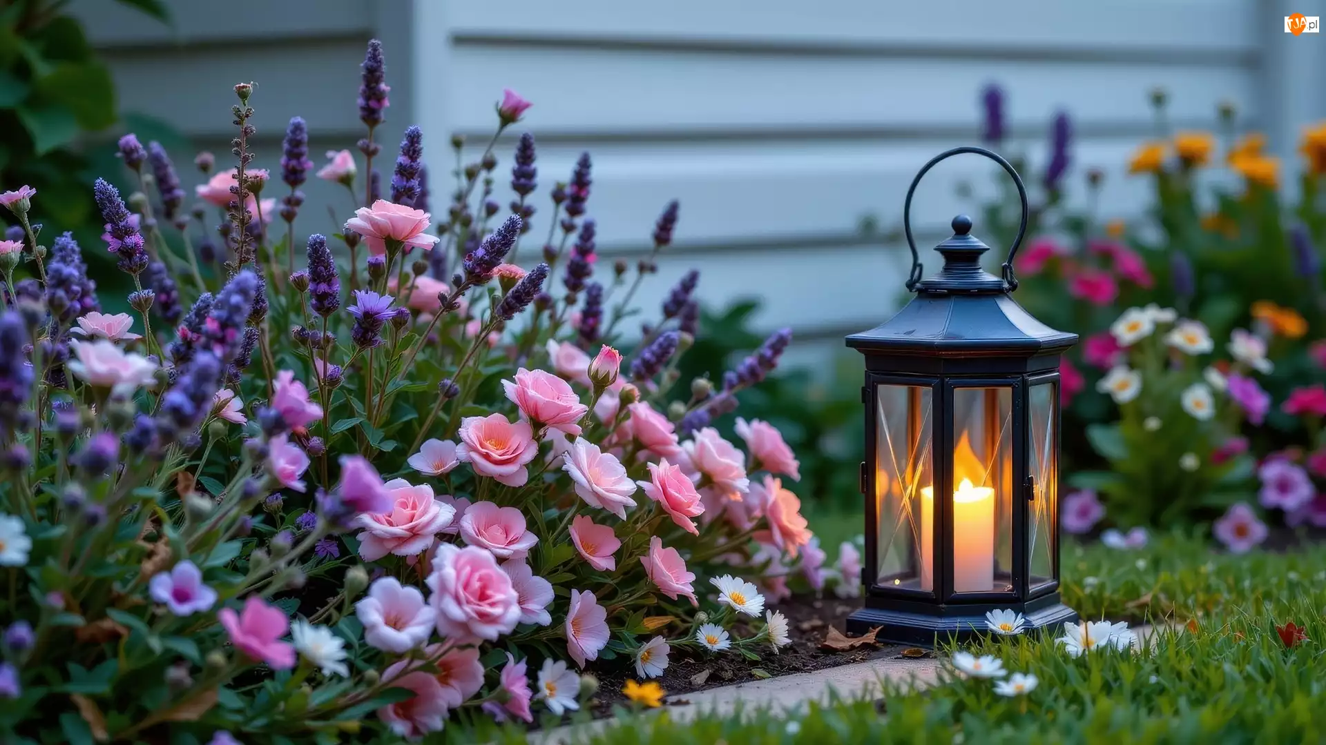 Różowe, Kwiaty, Świeca, Lampion, Fioletowe