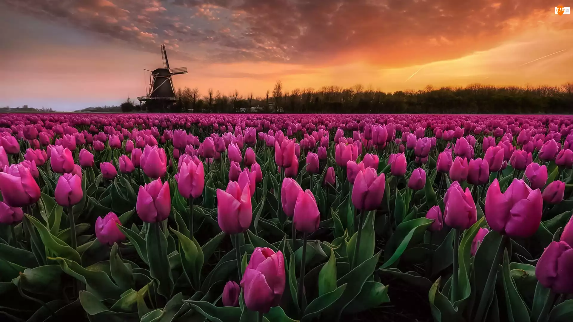 Różowe, Plantacja, Wiatrak, Zachód słońca, Tulipany, Drzewa