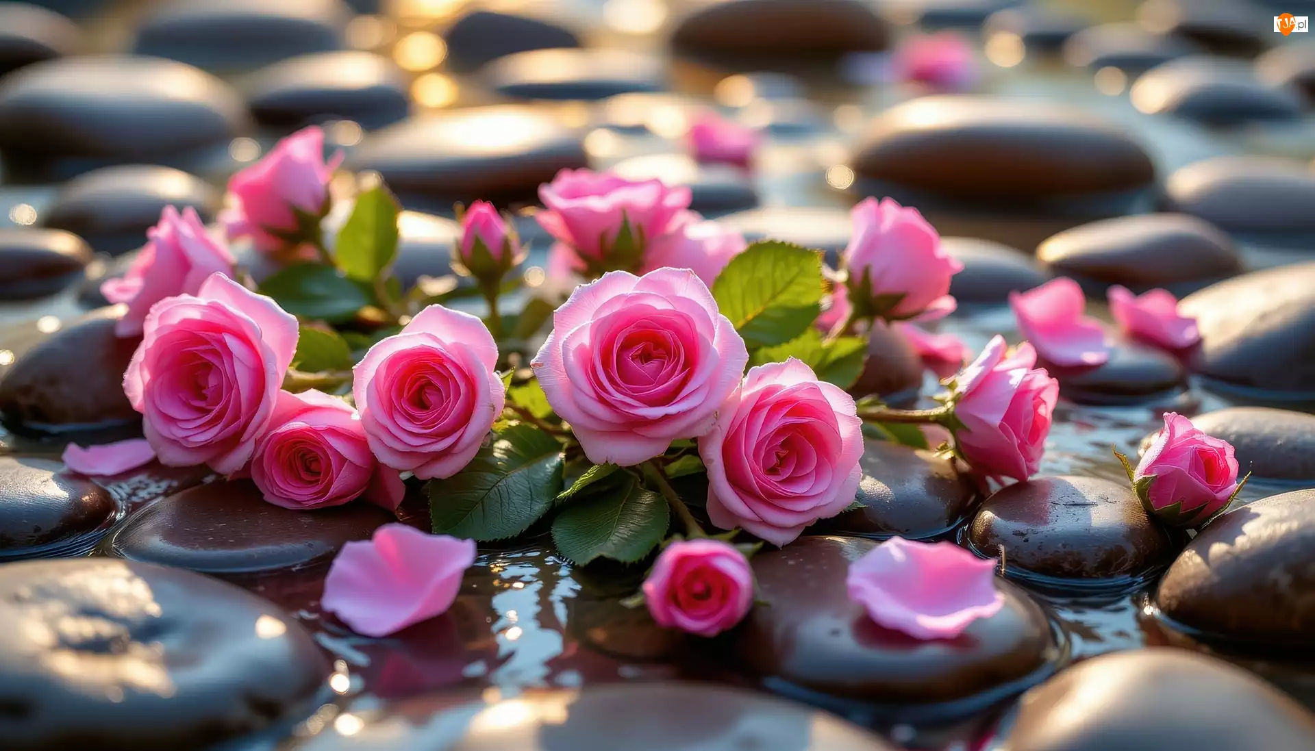 Różowe, Róże, Kamienie, Grafika AI, Kwiaty, Woda