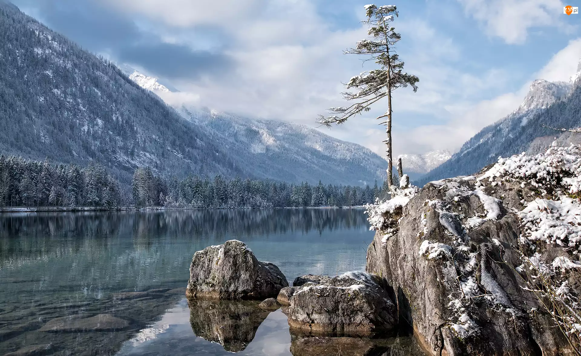 Góry, Kamienie, Zima, Skała, Rzeka, Drzewa