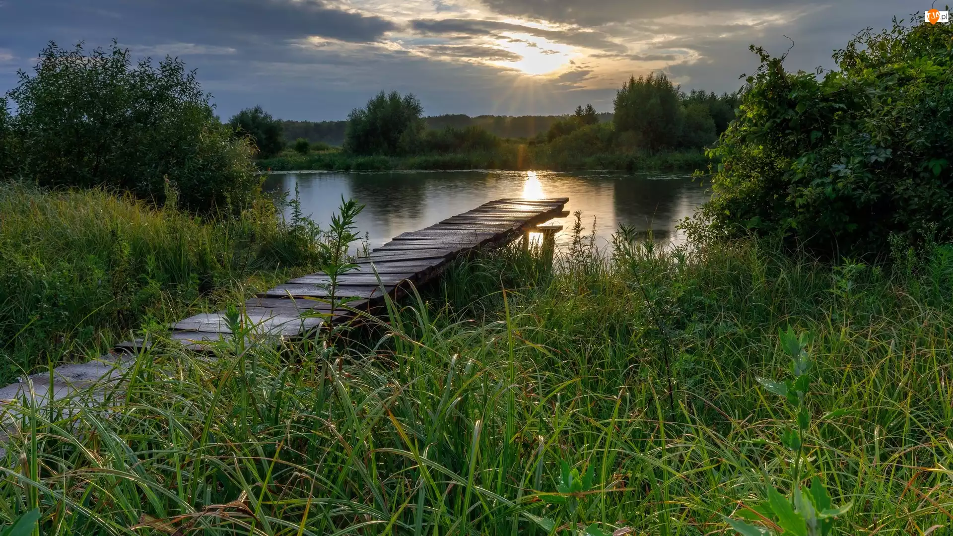 Pomost, Rzeka, Drzewa, Chmury, Trawa, Słońce