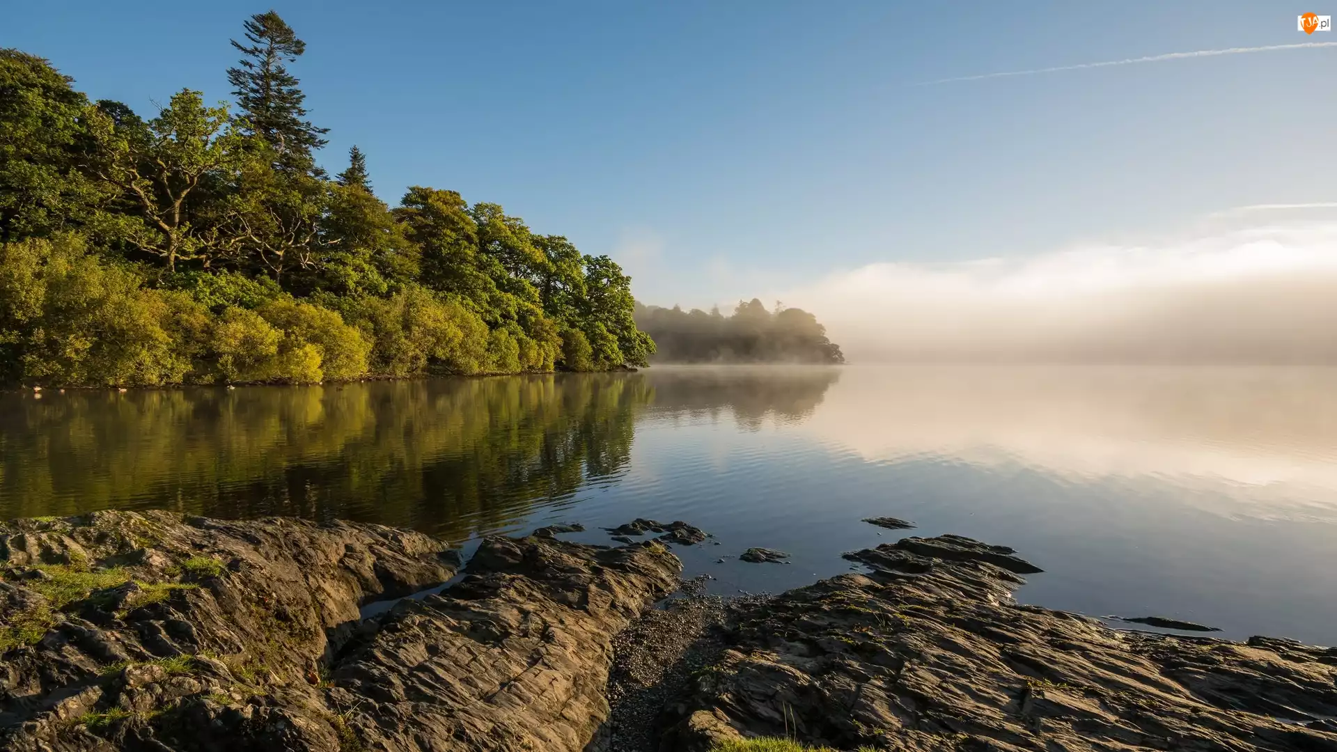Brzeg, Jezioro, Drzewa, Chmury, Skały, Niebo