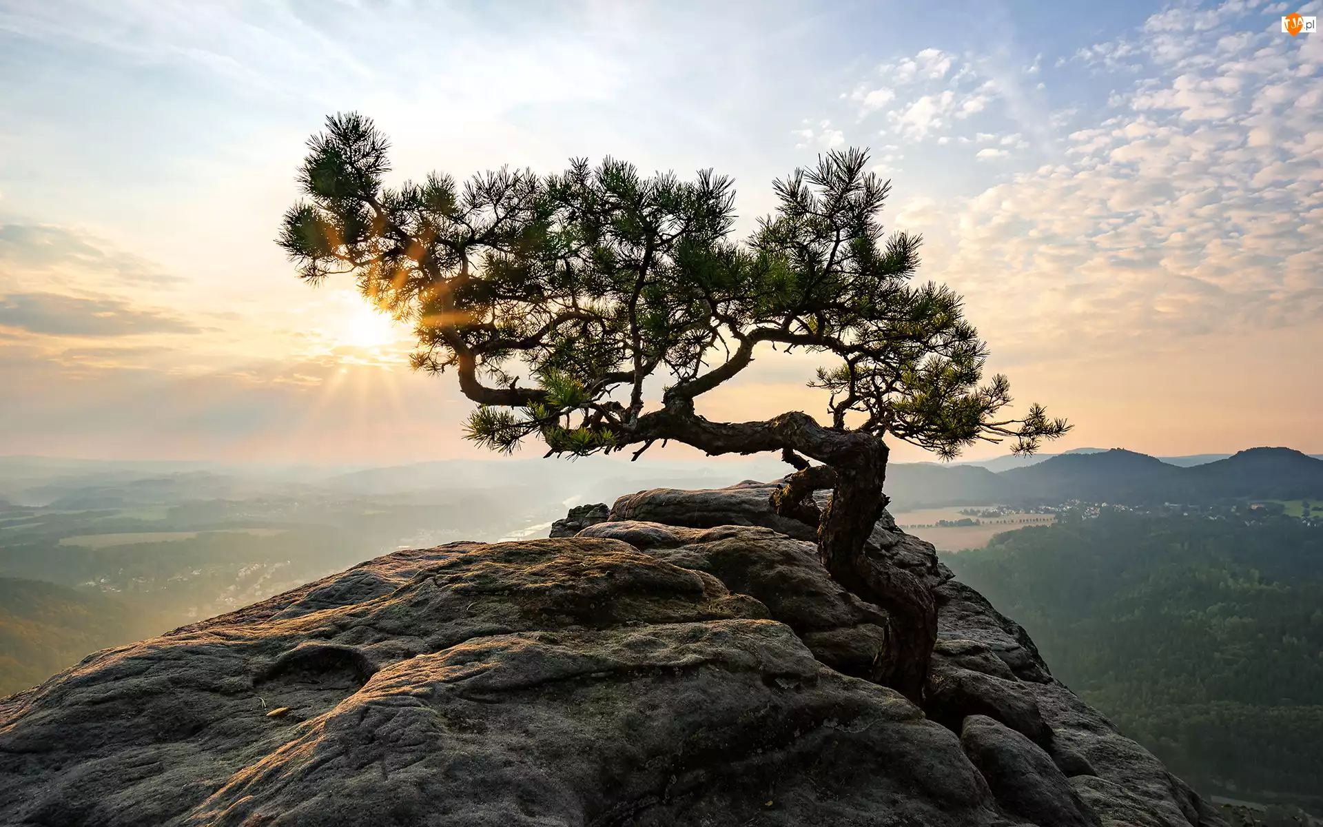 Góry, Drzewo, Niemcy, Promienie słońca, Szwajcaria Saksońska, Góra Lilienstein