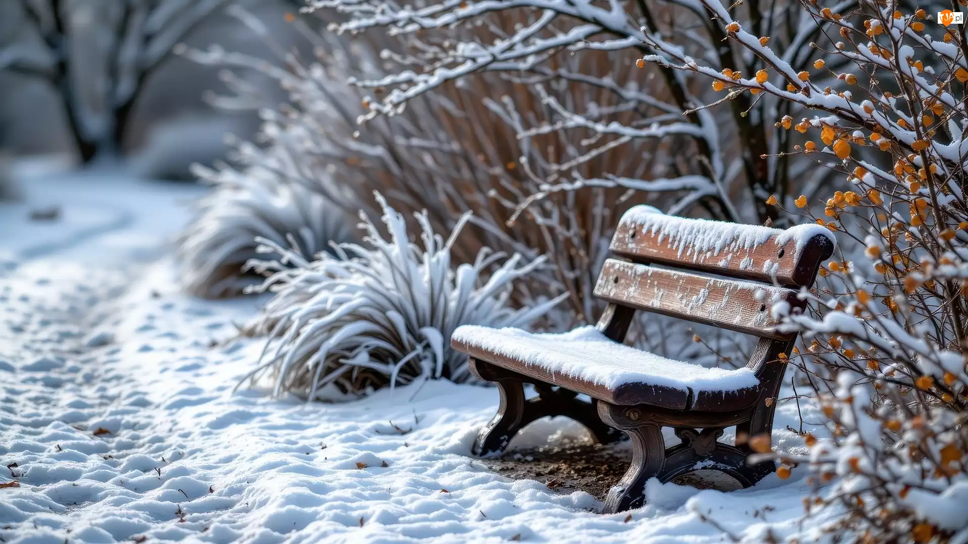 Śnieg, Zima, Ławka, Krzewy, Ośnieżona, Rośliny