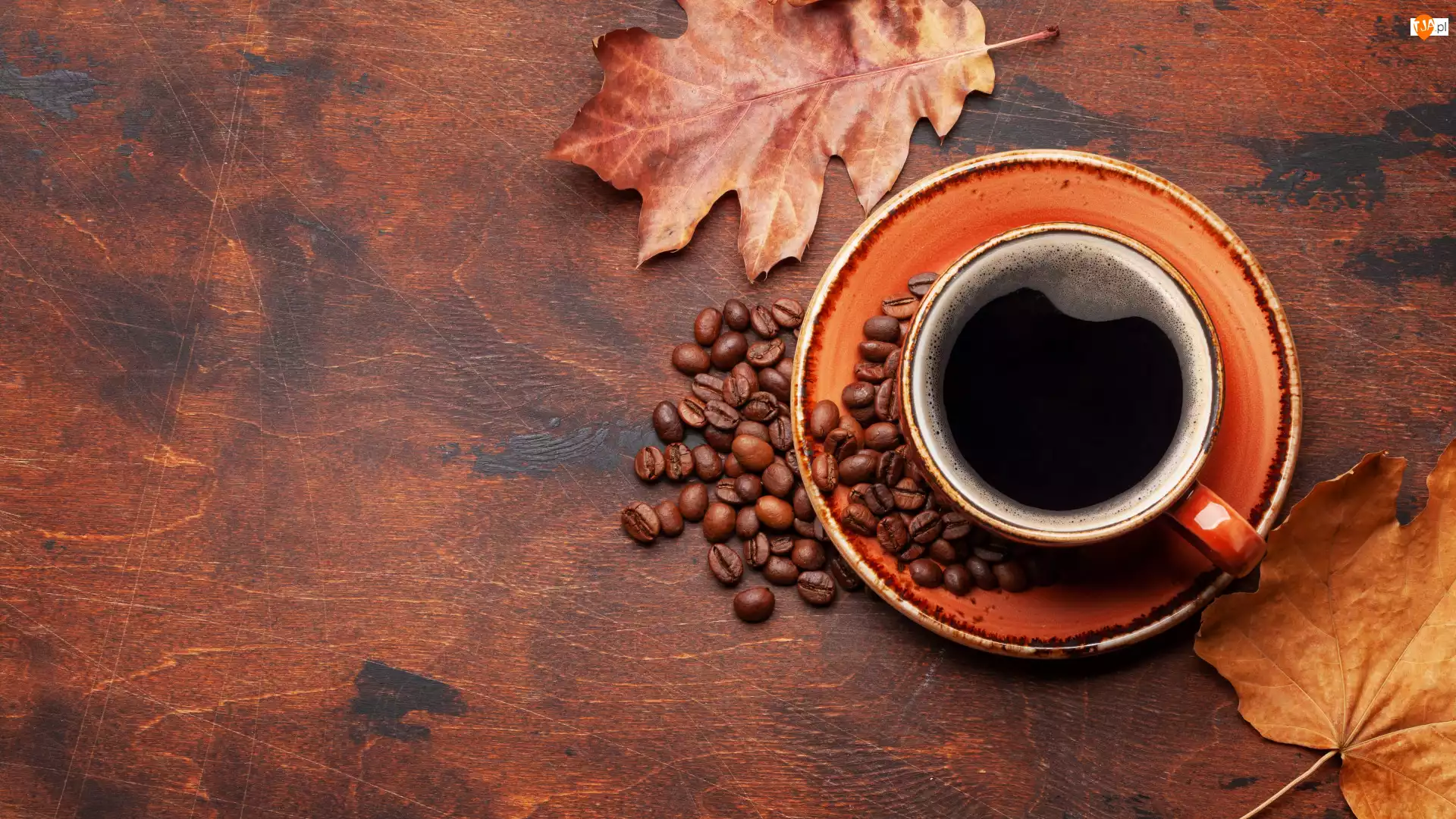 Spodek, Ziarna, Filiżanka, Liście, Kawa