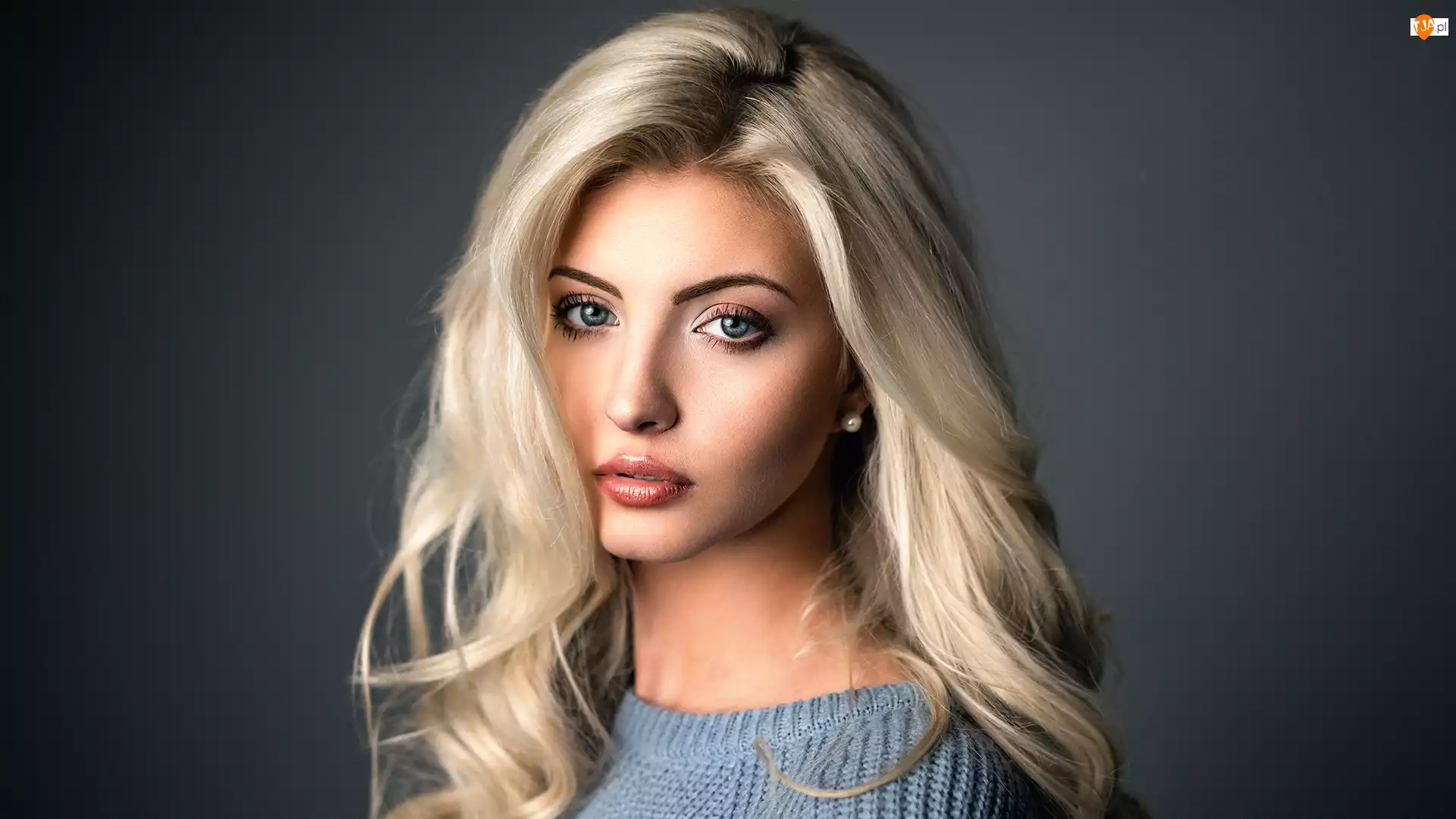 Spojrzenie pięknej blondynki w niebieskim swetrze