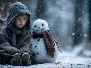 Grafika AI, Chłopiec, Bałwanek, Zima