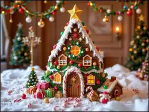 Piernik, Boże Narodzenie, Choinki, Prezenty, Domek, Bombki