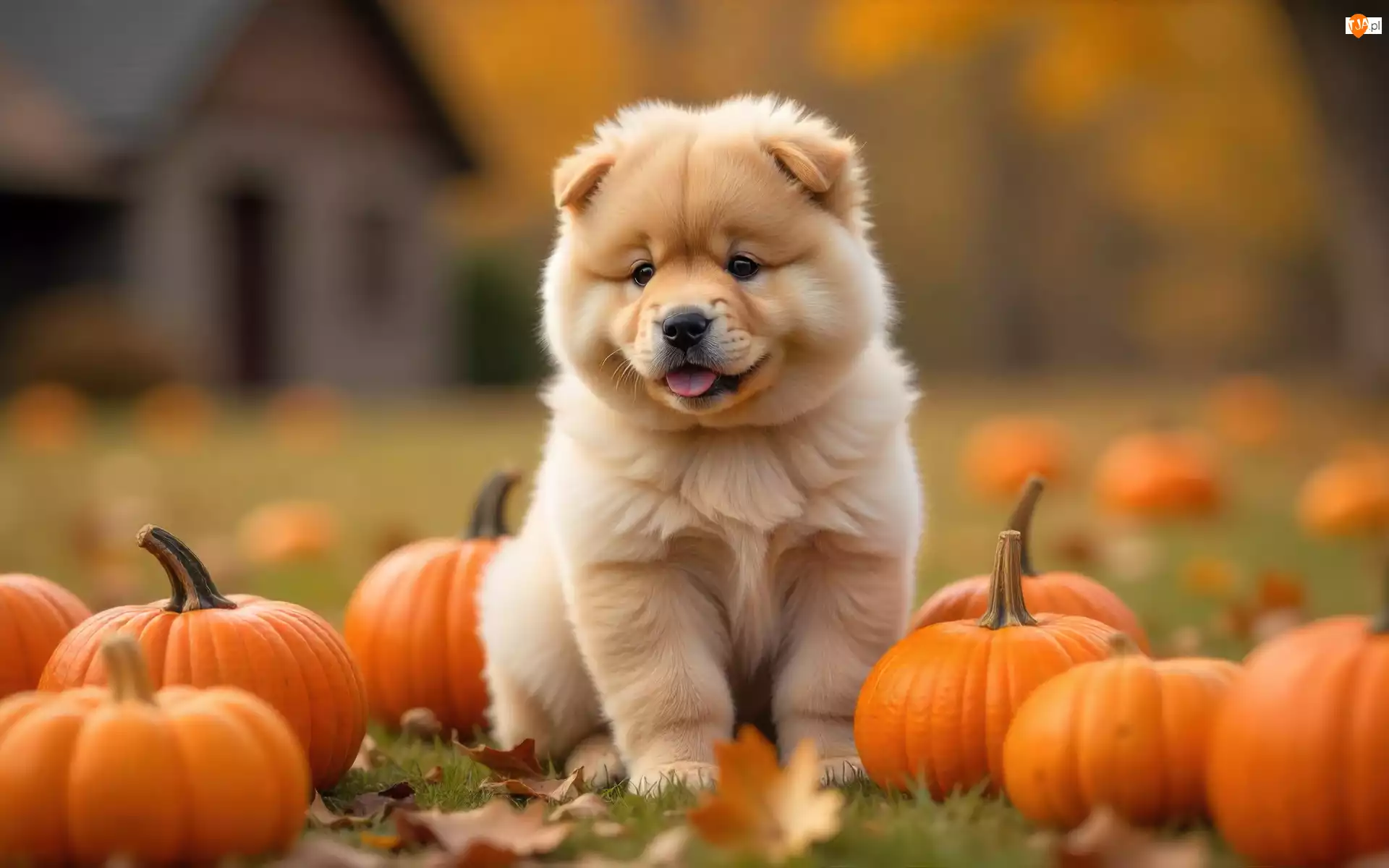 Szczeniak, Chow chow, Grafika AI, Pies, Jesień, Liście, Dynie